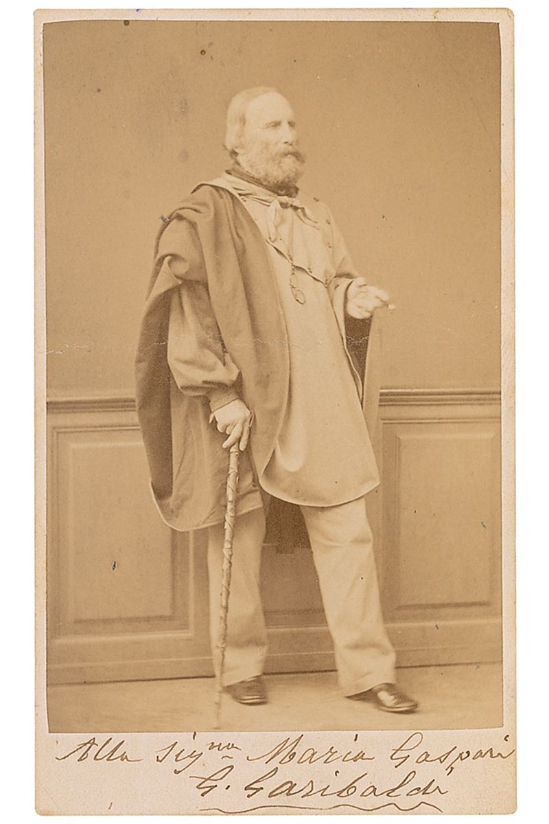 Italian patriot and soldier (1807–1882) best known for leading the attack of the ‘Red Shirts’ on Sicily in 1860. Original 2.5 x 4 carte-de-visite full-length portrait of Garibaldi using a cane, signed and inscribed in the lower border in black ink, “Alla sign’a Maria Gaspari, G. Garibaldio.” Published by Cesare Bernieri of Torino. Central horizontal crease, otherwise fine condition.