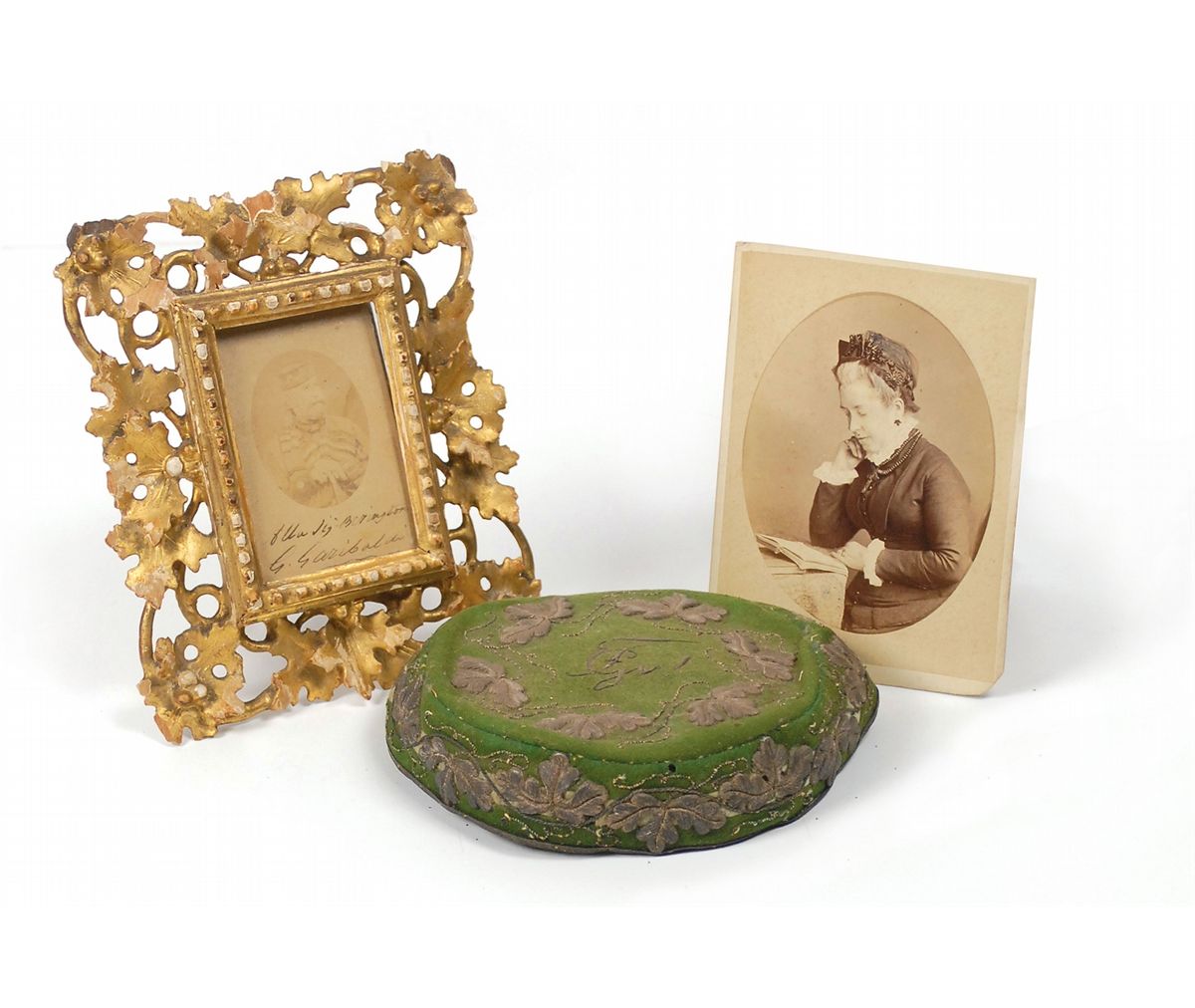 Italian patriot and soldier (1807–1882) best known for leading the attack of the ‘Red Shirts’ on Sicily in 1860. Uncommon 2.25 x 3.5 carte-de-visite portrait of Garibaldi posing with his hands clasped over a cane handle, signed and inscribed below the image in black ink, “Alla Sig. Bevington, Giuseppe Garibaldi.” Presented in a period wooden frame carved with elaborate ornamental leaves to an overall size of 6 x 7.5. Also includes a green baize felt pillbox hat believed to be Garibaldi’s, decorated in oak leaves of silver thread and with a “T. G.” monogram to the crown. Hat’s lining is indistinctly stamped with the maker’s mark of Theodor Klein, Heidelberg. An unsigned cabinet photo of Mrs. Henry Portsmouth Bevington, recipient of the signed photo and hat, is also present. Signed photo in fine condition, with some chipping to frame; hat in very good condition, with interior lining dry and brittle, and other small holes and soiling. Accompanied by a letter of provenance from Bevington’s great grandson, affirming the chain of ownership. Bevington aided Garibaldi’s League of Democracy in 1879, which advocated universal suffrage, abolition of ecclesiastical property, emancipation of women, and maintenance of a standing army; her family also believes that she was one of his mistresses. A one-of-a-kind grouping with excellent provenance.