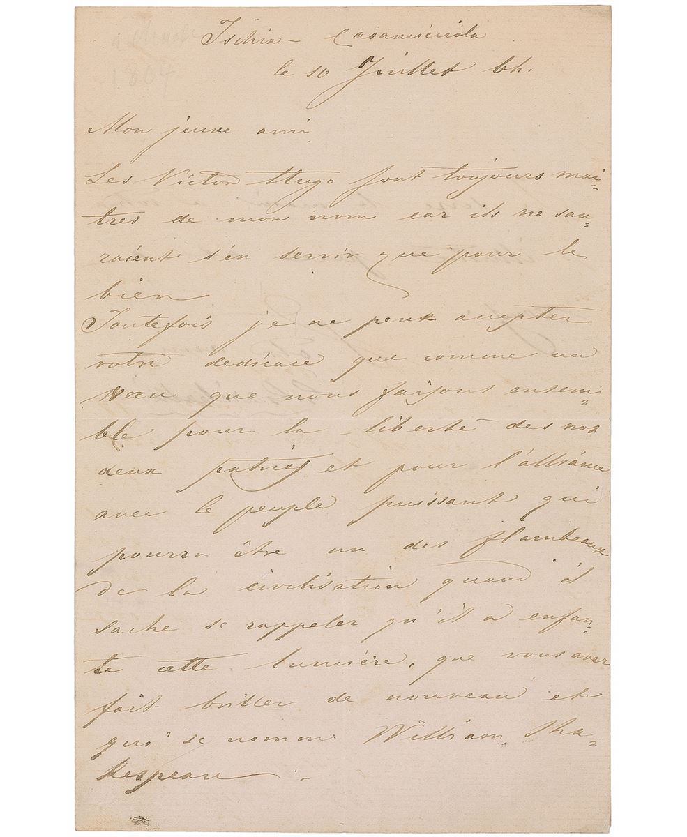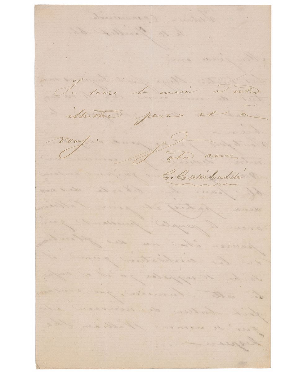 ALS in French, signed “G. Garibaldi,” one page, 5.25 x 8, July 10, [1864]. Letter to Francois-Victor Hugo, son of the famous writer. In full (translated): "The Victor Hugos have always a right to do what they like with my name, for they never will use it but for a good purpose. At all events, I can only accept your dedication as a vow that we make together for the liberty of our two countries, and for the alliance with that mighty people which may be one of the lights of civilization when it shall remember that it kindled the flame which you have made to shine anew, and which is named William Shakespeare. I shake hands with your illustrious father and yourself." In fine condition, with central vertical and horizontal folds and the writing a shade light. Francois-Victor Hugo translated the works of William Shakespeare into French, released in eighteen volumes between 1859 and 1866. Like his father, Francois-Victor was politically active and dedicated the thirteenth volume, published in 1864, to Garibaldi.