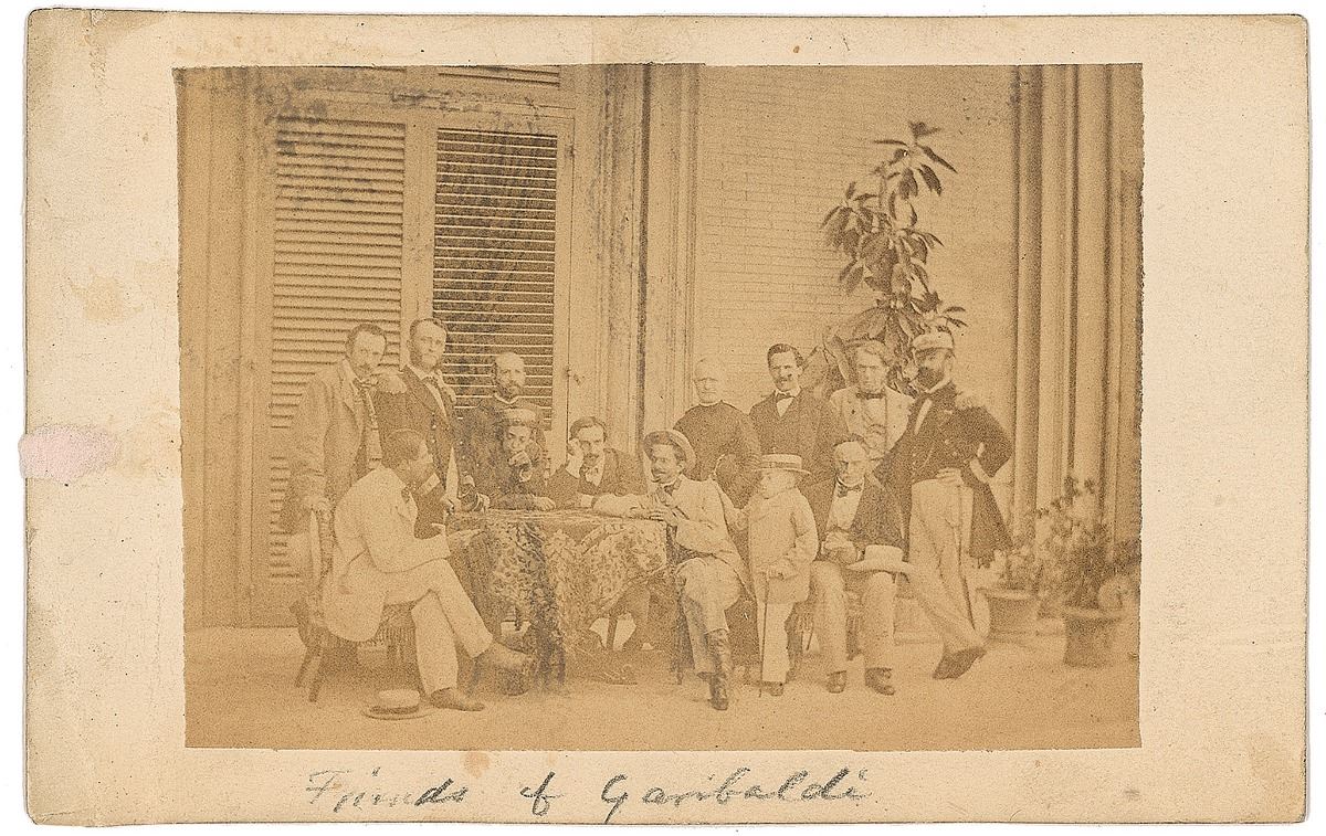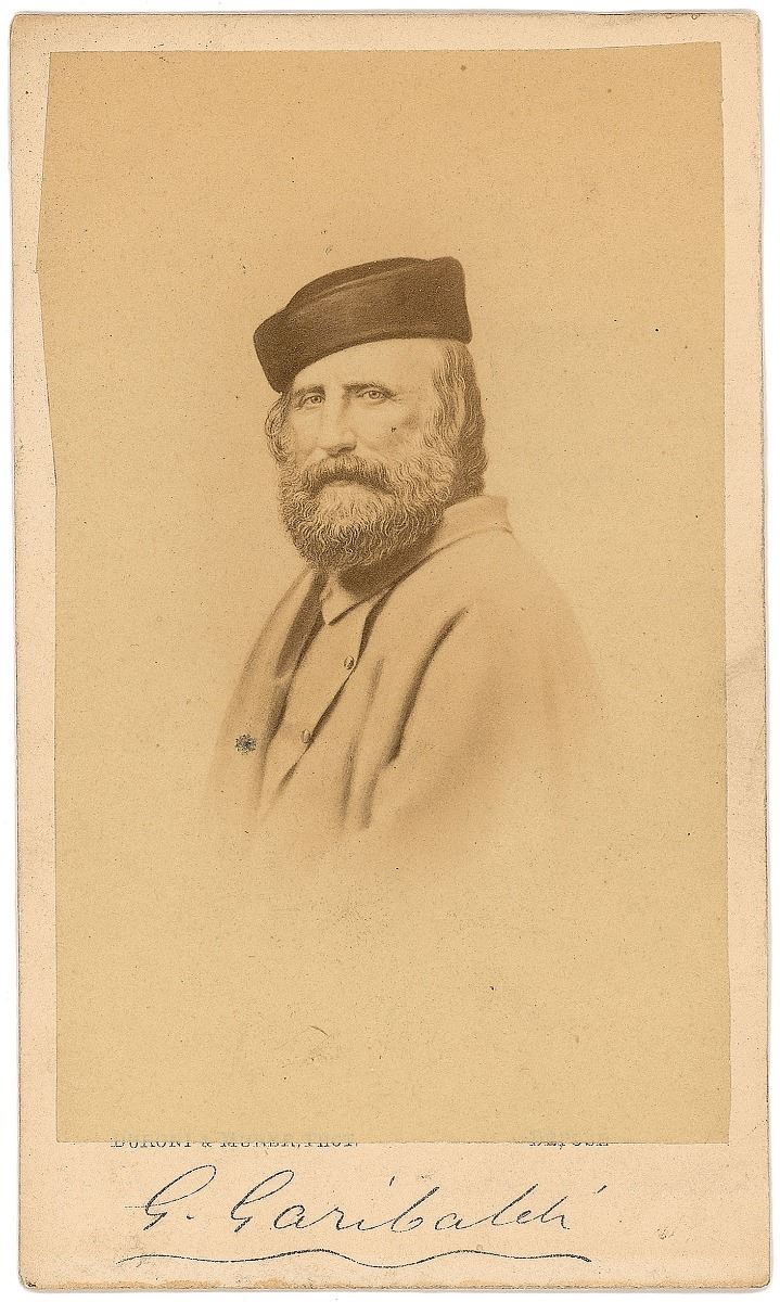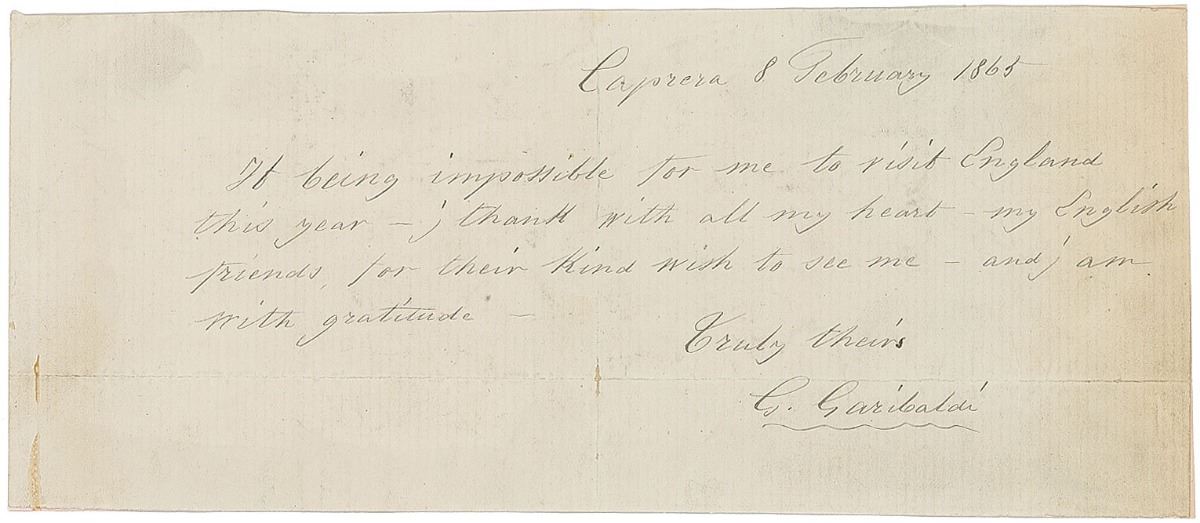 ALS signed “G. Garibaldi,” one page, 8.25 x 3.5, February 8, 1865. In full: “It being impossible for me to visit England this year—I thank with all my heart—my English friends for their kind wish to see me—and I am with gratitude.” Affixed to a same-size sheet. In fine condition, with horizontal and vertical folds (horizontal fold touching the tips of two letters of the signature) and slight wrinkling and soiling. Accompanied by an unsigned carte-de-visite of Garibaldi, two similar size photos showing Garibaldi’s residence and friends, and a large artistic depiction of the revered Italian patriot.