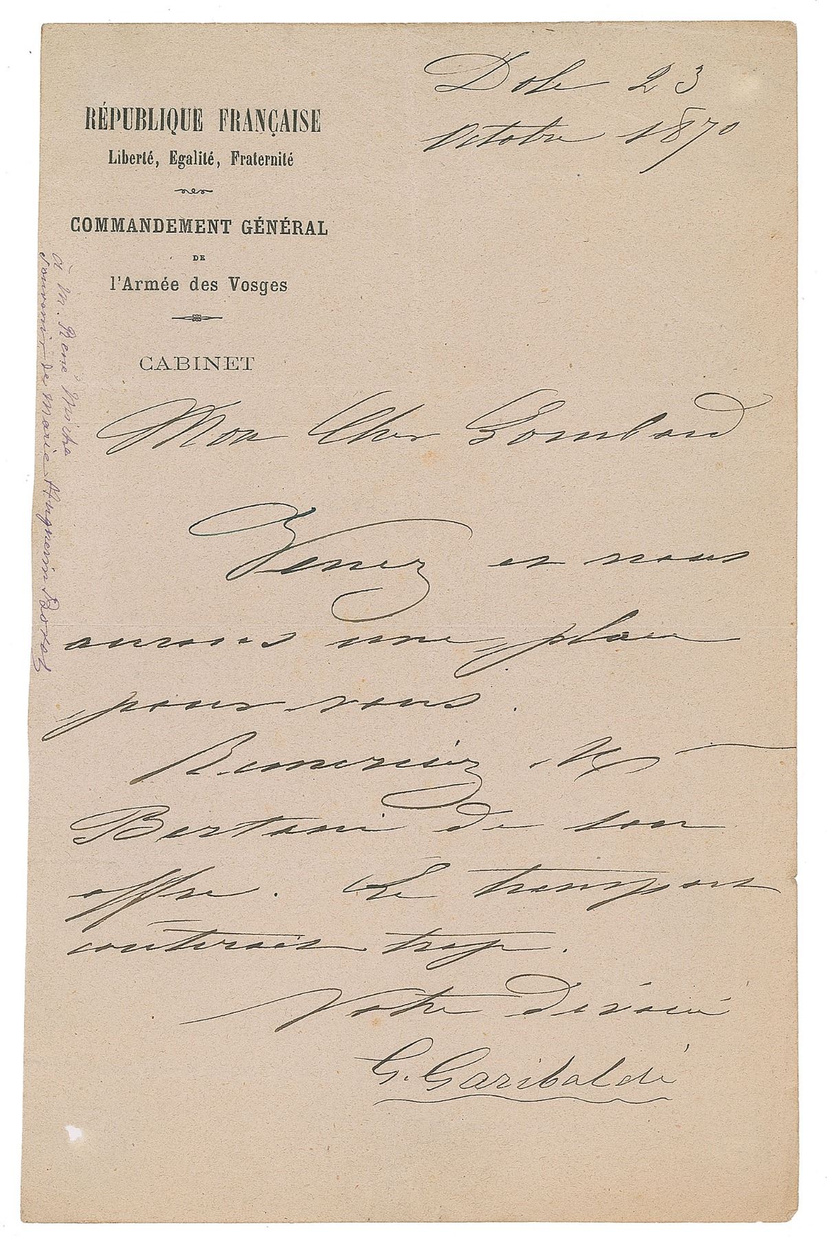 Italian patriot and soldier (1807–1882) best known for leading the attack of the 'Red Shirts' on Sicily in 1860. LS in French, signed “G. Garibaldi,” one page, 5.25 x 8.25, Armee des Vosges letterhead, October 23, 1870. Untranslated letter sent early in his command of the Army of the Vosges during the Franco-Prussian War. In fine condition, with scattered light creasing and a small hole to the lower left blank area. Boasting a worldwide reputation as a liberal revolutionary, Garibaldi offered his services to the French Third Republic in their struggle against Prussia. He assumed command of troops at Marseille on November 7, 1870, and soon surprised a Prussian force of one thousand men at Chatillon. Subsequent skirmishes were less successful, and the Army of the Vosges was forced to retreat to Dijon.