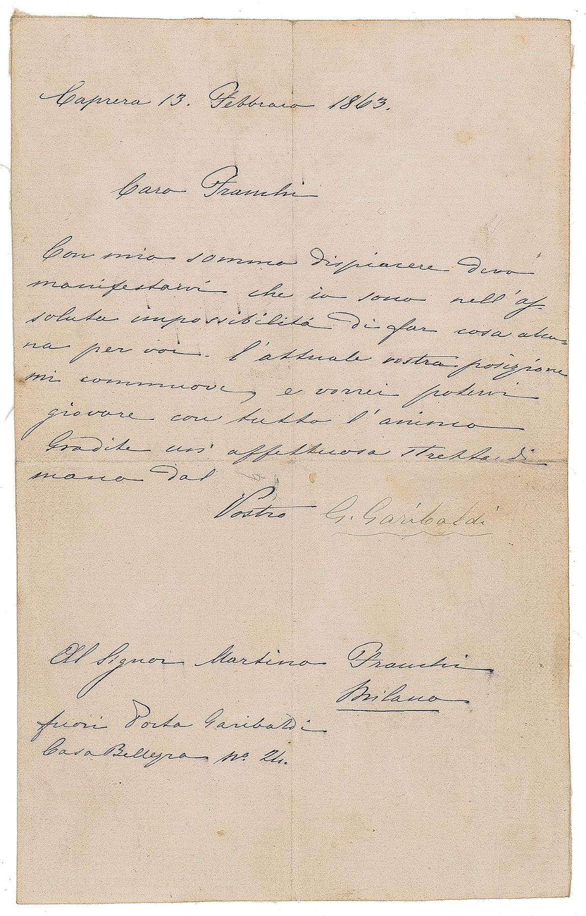 Italian patriot and soldier (1807–1882) best known for leading the attack of the 'Red Shirts' on Sicily in 1860. LS in Italian, signed “G. Garibaldi,” one page, February 13, 1863. Untranslated letter to Martino Franchi. In very good condition, with light soiling and creasing, and the signature several shades light but fully legible; reverse of the letter is professionally linen-backed.