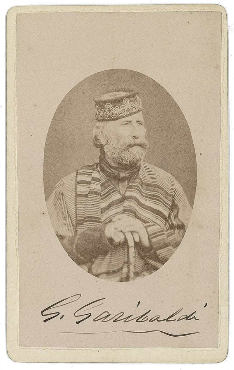 Italian patriot and soldier (1807–1882) best known for leading the attack of the ‘Red Shirts’ on Sicily in 1860. Original and uncommon 2.5 x 4 carte-de-visite photo of Garibaldi in uniform, signed under his image in black ink. In fine condition, with mounting remnants to reverse.