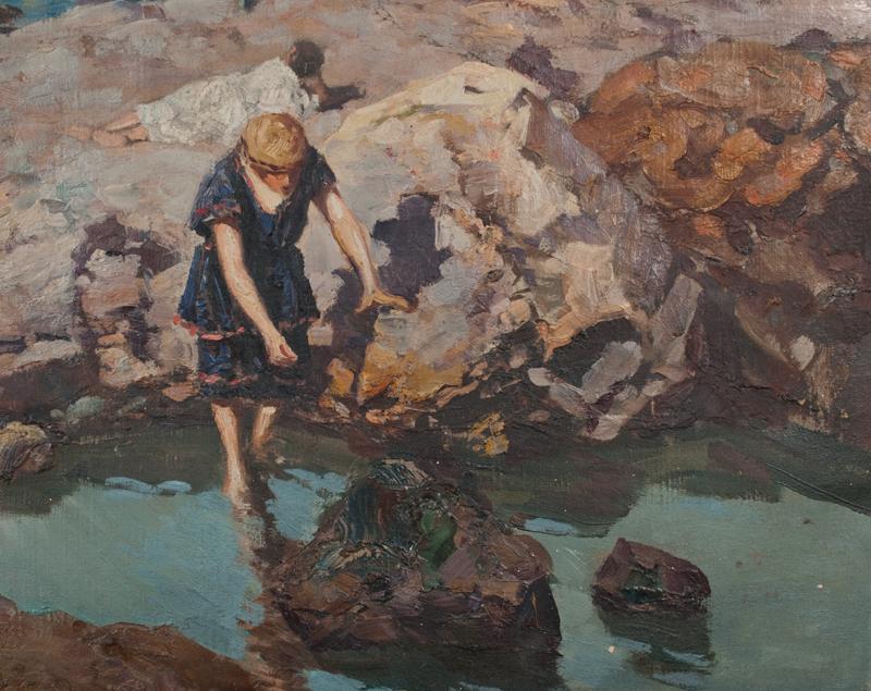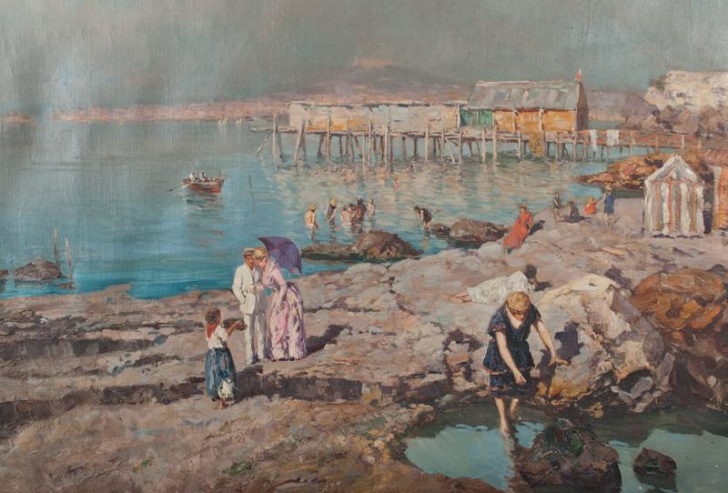 A large and exceptional painting depicting a beach scene with children swimming, people walking on the beach, and a lady probably picking clams out of a rocky pool of water, with a boardwalk in the background and two men in a row boat, signed lower right,Giuseppe Giardiello (1877-1920) was an Itilian artist known for his beach scenes with families and children.29.5"H x 39.75"W, sight, 39.5"H x 49 75"W framed,condition canvas slightly loose, could use a cleaning, otherwise untouched original condition. Prvate collection for the last 50 plus years.