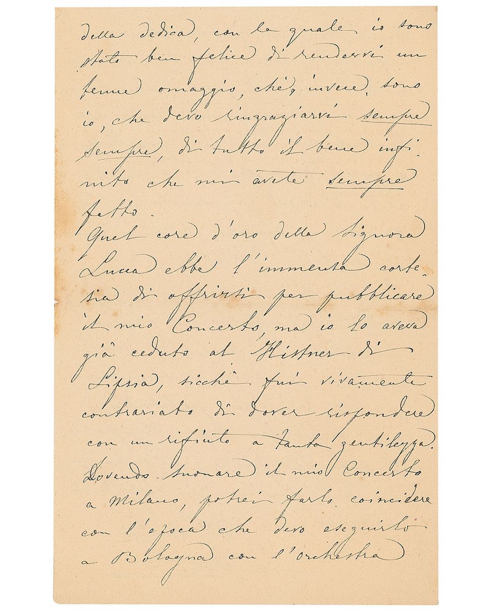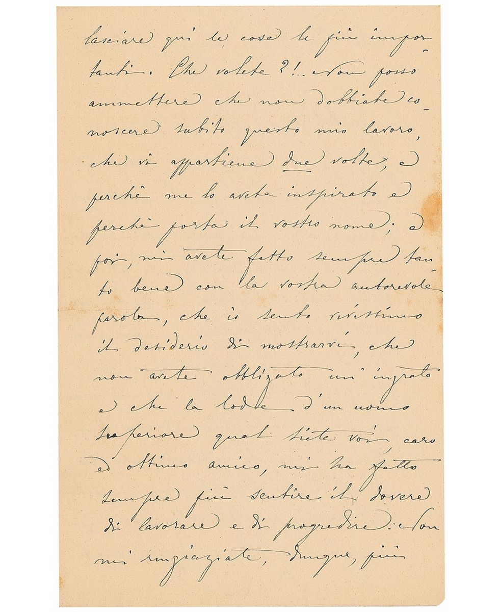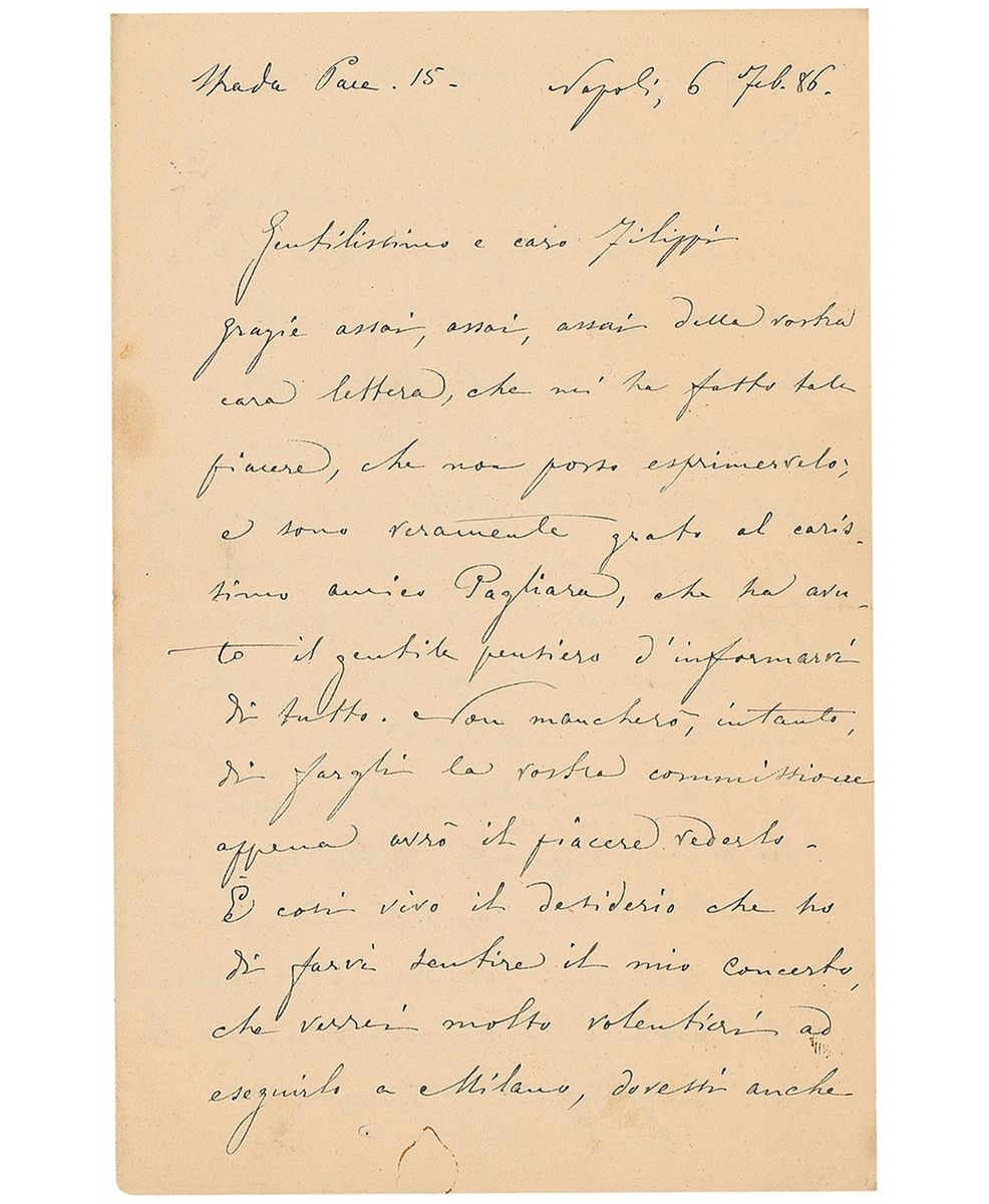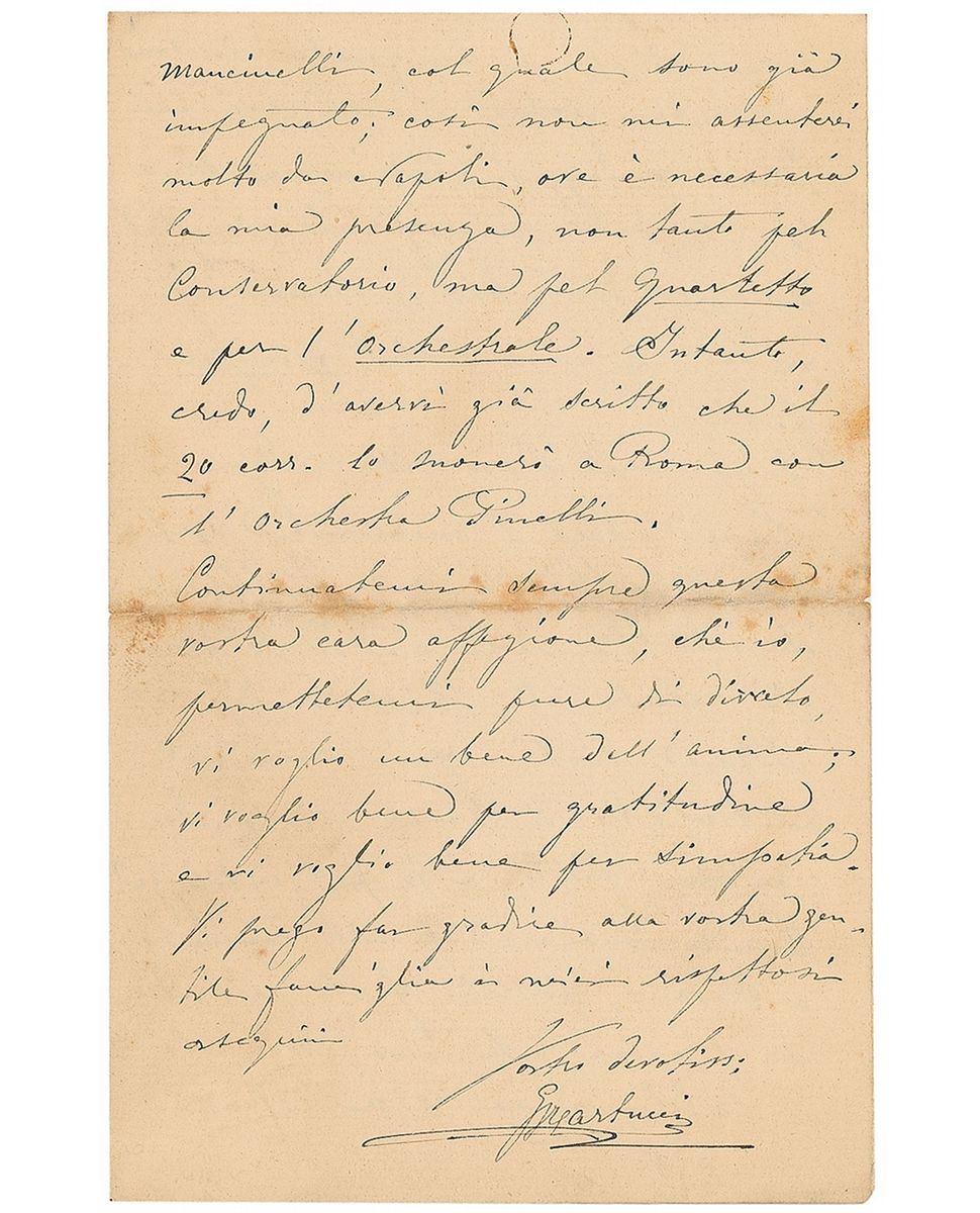 Important Italian composer, conductor, and pianist (1858–1909) who helped introduce the works of Richard Wagner to Italy. ALS in Italian, signed “G. Martucci,” four pages on two adjoining sheets, 4.5 x 7, Naples, February 6, 1886. Letter to a gentleman, possibly a patron. In part (translated): “I am so anxious to have you hear my concerto that I would very gladly come to Milan to play it, even though it would mean neglecting important matters here. What can I say? It seems impossible that you have not heard this work of mine which belongs to you doubly; first, because you inspired me, and second, because it is named after you…In fact, my dear friend, I want to point out that it is your praise that has always inspired me to work harder and to try to improve.” Some scattered foxing, otherwise fine condition. Accompanied by a full translation. The piece he refers to is his Concerto in B-Flat Minor for Piano and Orchestra. Uncommon in any format, this is the first Martucci we have offered.