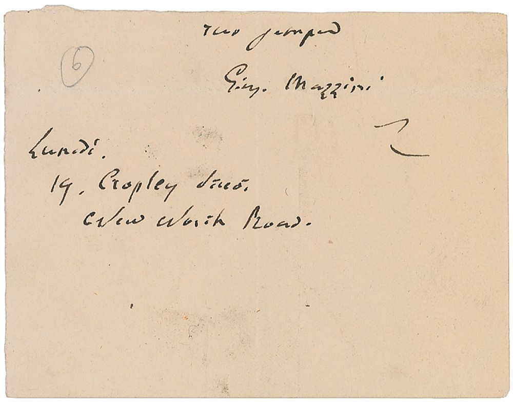 Italian patriot (1805–1872) who dedicated his life, much of which was spent in exile, to uniting his country under a republic. Scarce ink signature, “Gius Mazzini,” on an off-white 3.5 x 2.75 slip, clipped from the closing of a letter, with the letter recipient’s address written in the lower left by Mazzini. Intersecting folds lightly passing through portion of signature, scattered soiling, and a pencil notation to left side, otherwise fine condition.
