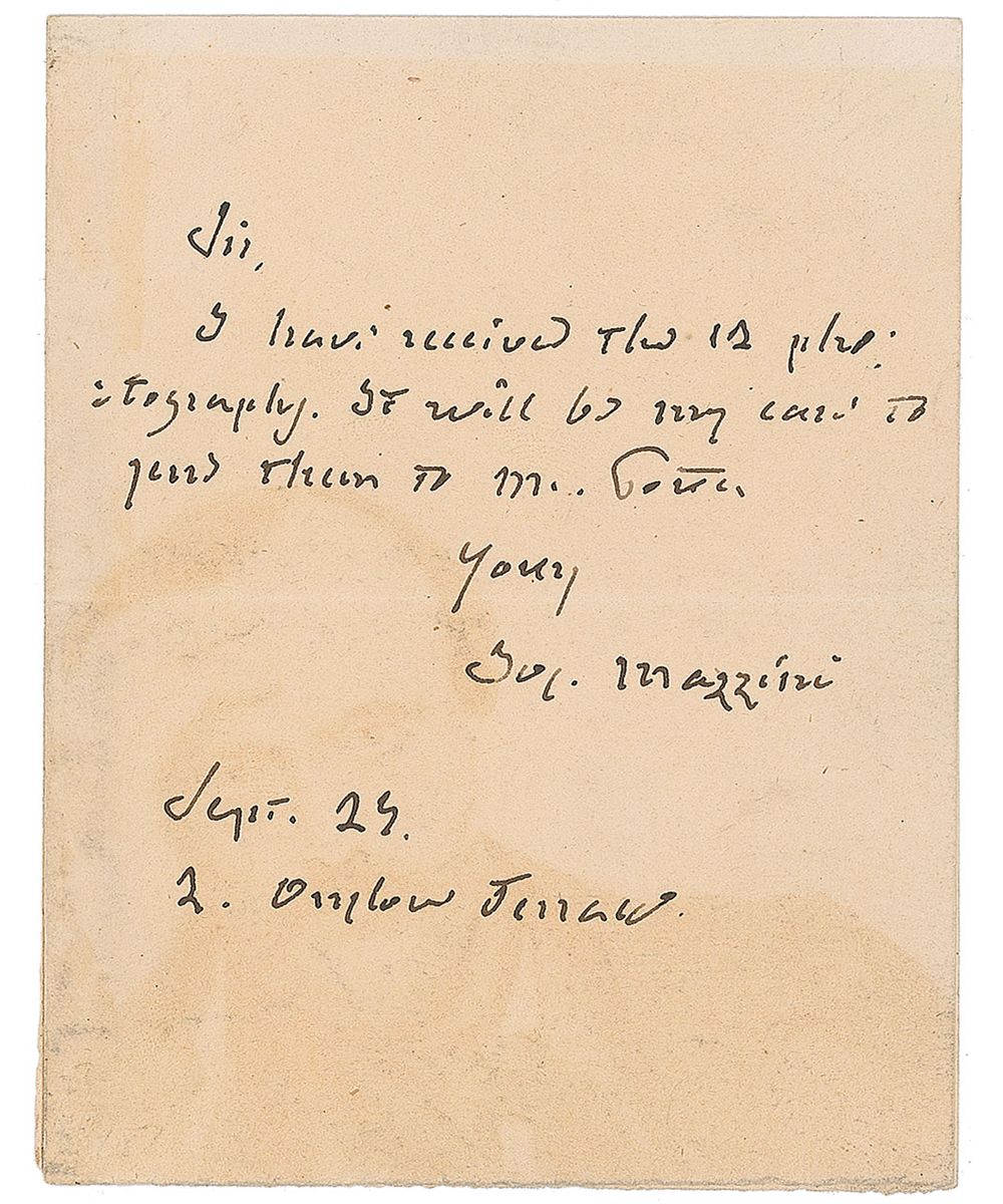 Italian patriot (1805–1872) who dedicated his life, much of which was spent in exile, to uniting his country under a republic. Uncommon ALS signed “Jos. Mazzini,” one page, 3.5 x 4.5, September 29, no year. Letter to a gentleman. In full: “I have received the 12 photographs. It will be my care to send them to Mr. Porter.” In fine condition, with some irregular staining from being pressed against a photo.