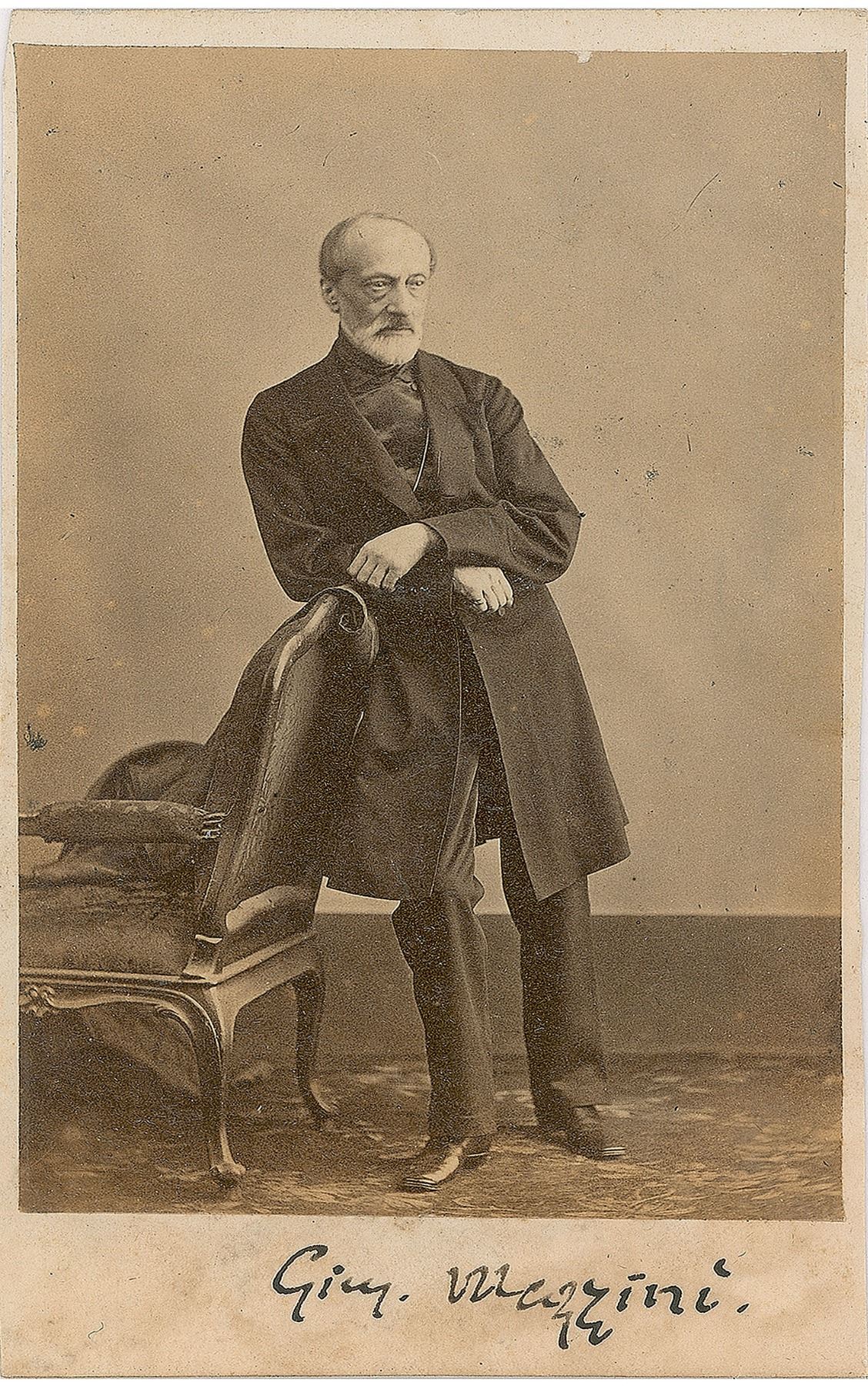 Italian patriot (1805–1872) who dedicated his life, much of which was spent in exile, to uniting his country under a republic. Sharp 2.25 x 4 carte-de-visite portrait of Mazzini in a long coat by D. Lama of London, signed on the mount in black ink, "Gius. Mazzini." In very good to fine condition, with trimmed edges, light staining in the signature area, and partial delamination at the bottom of the mount.