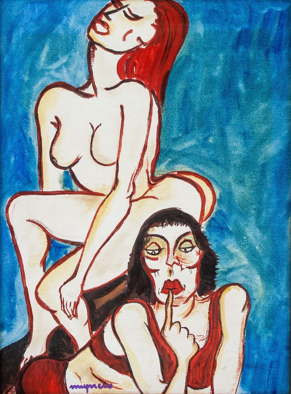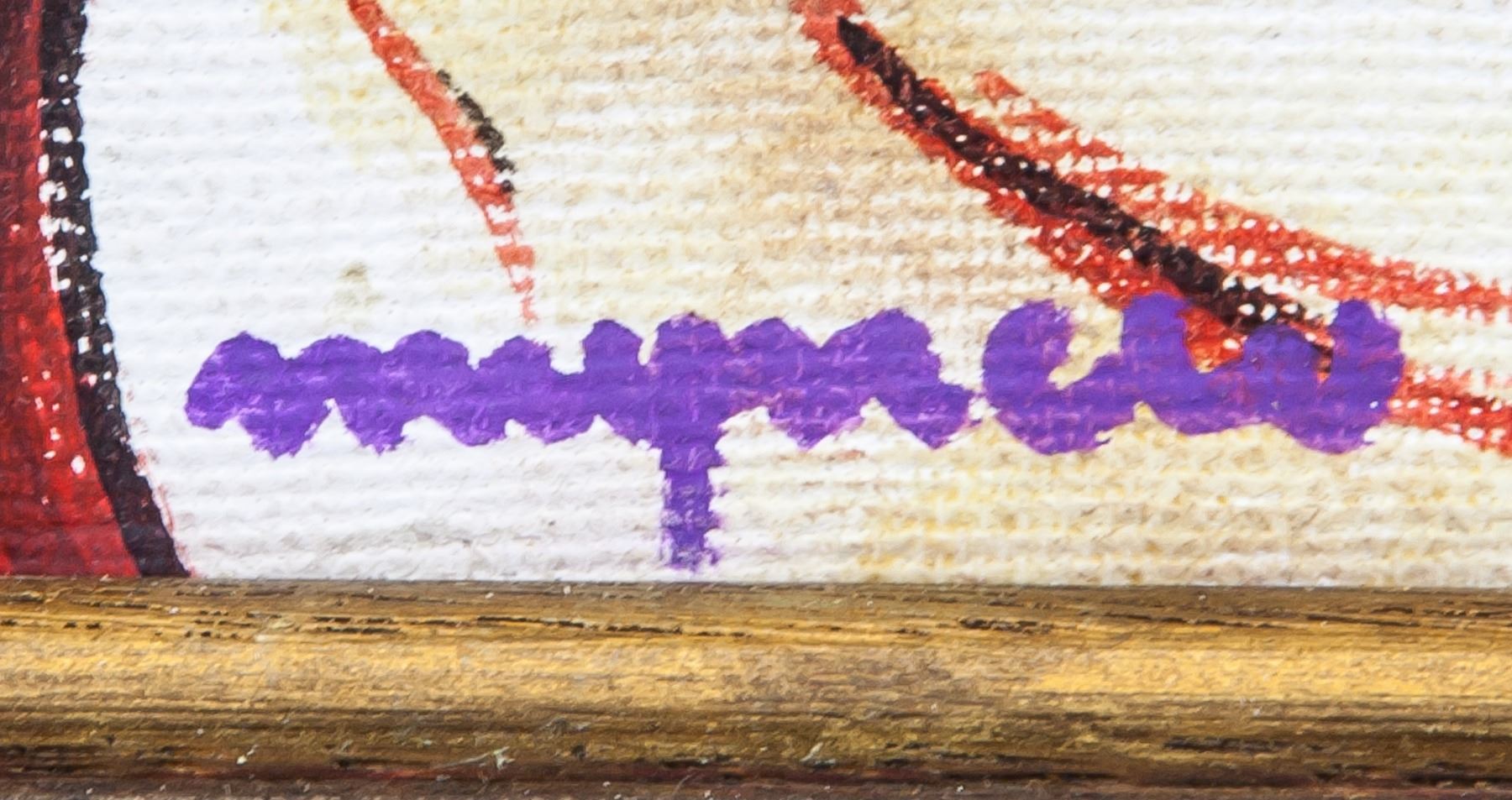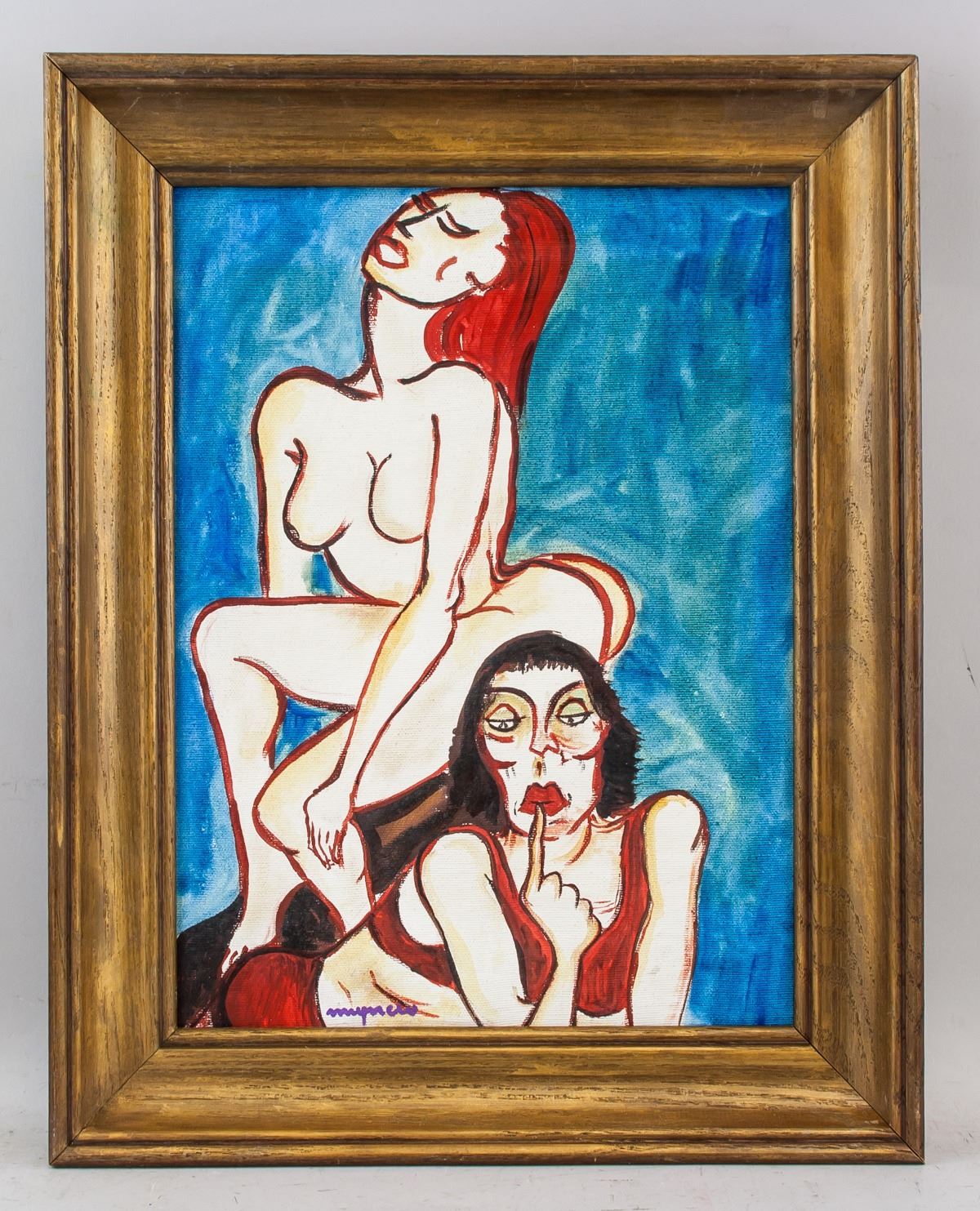 Oil on canvas, framed. Featuring a portrait of two figures. Signed Migneco on the lower left corner. Attributed to Giuseppe Migneco (1908-1997, Italian). 38.5 x 28 cm (15.2 x 11.0 inches). Frame size: 49 x 39 cm (19.3 x 15.4 inches). PROVENANCE: Southern Ontario estate