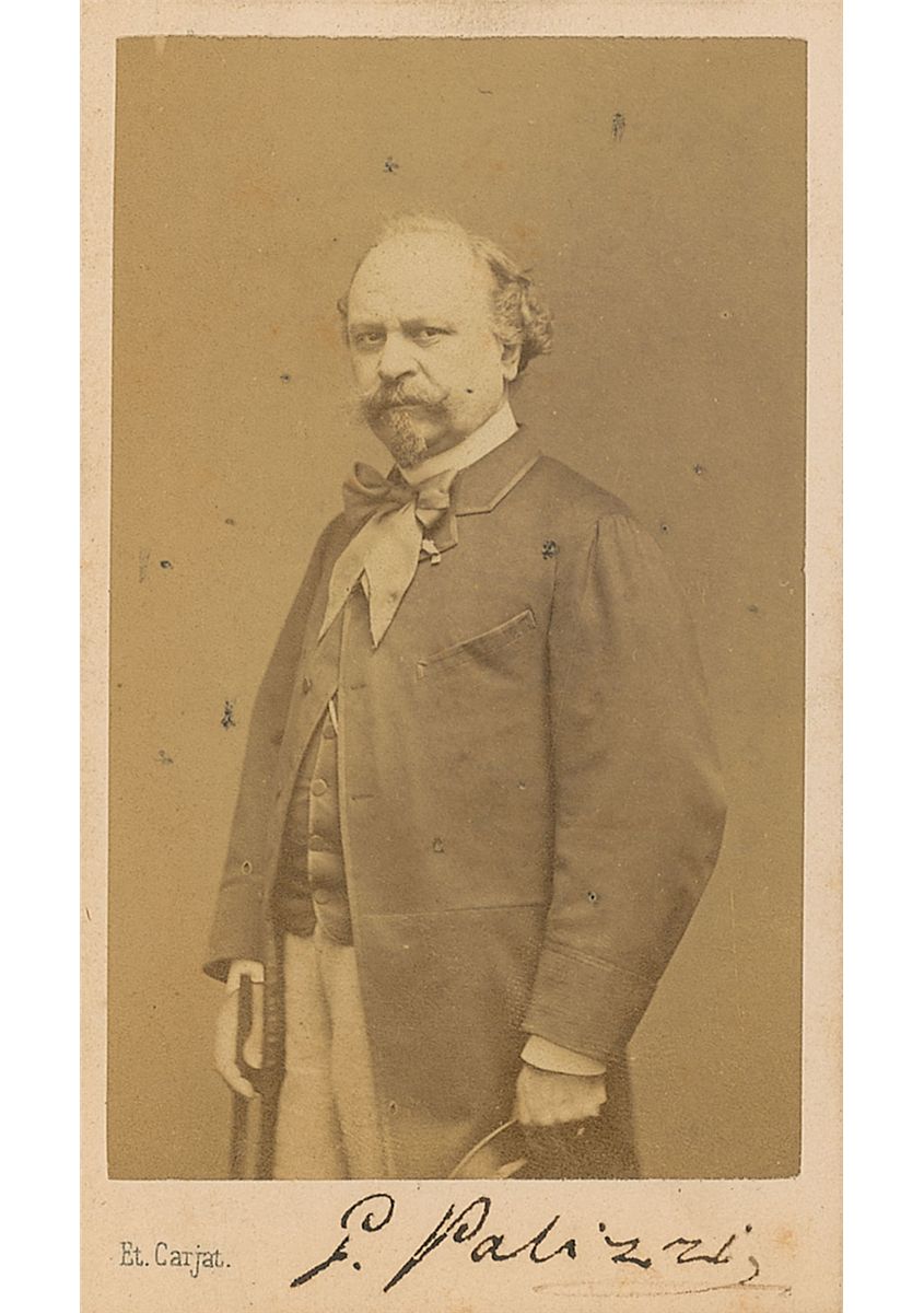 Italian landscape and animal painter (1812–1888). Original 2.25 x 4 carte-de-visite photo of Palizzi holding his hat by Carjat, signed in the lower border in black ink, “G. Palizzi.” In fine condition, with some scattered ink spots to image and a bit of light soiling to lower border.