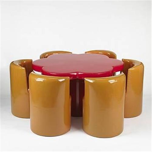 Giuseppe Raimondi Margherita dining set Gufram/Stendig Italy, c. 1968 vinyl over wood, steel 52"dia x 30"h Imported and distributed exclusively by Stendig. Distributor's label to bottom of table: [Original Design Stendig Made in Italy].