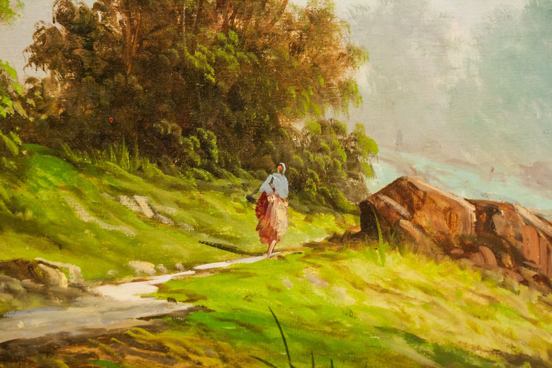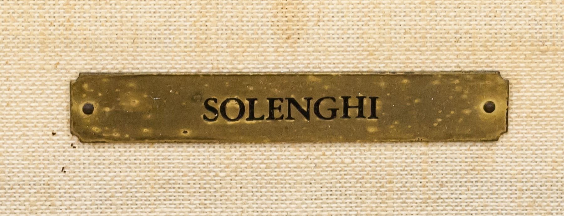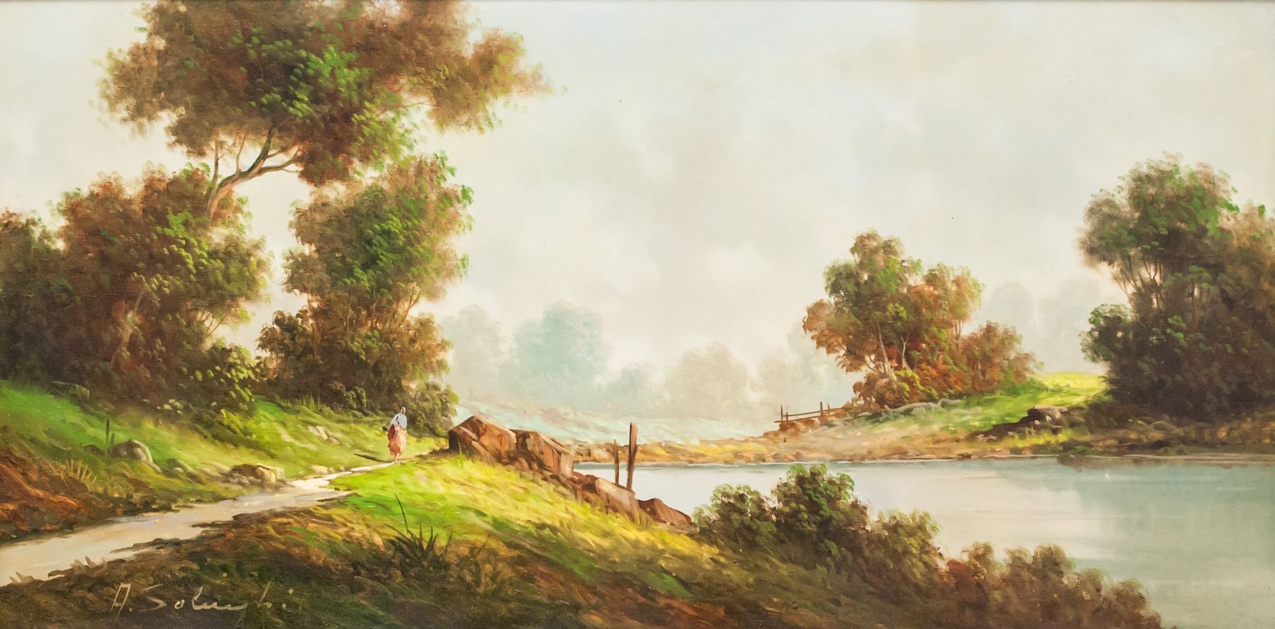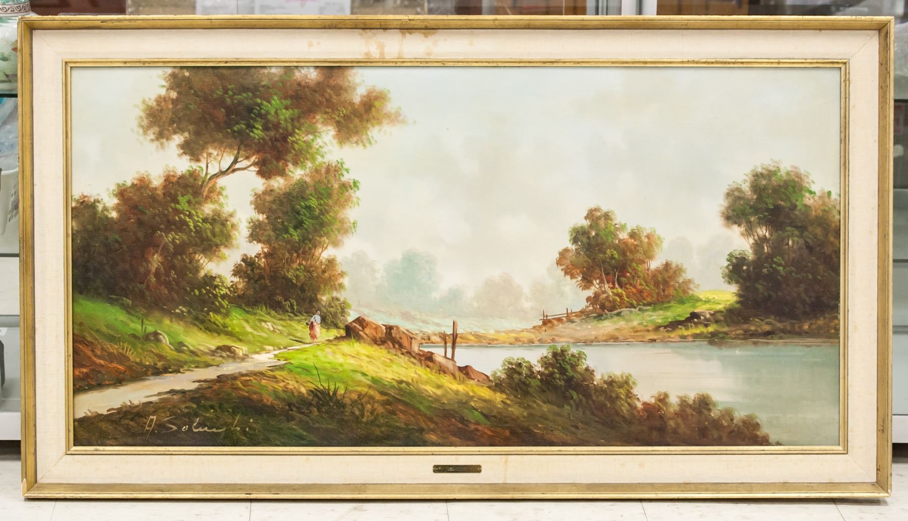 Oil on canvas, framed. Featuring a landscape scene of river and figure. Signed G. Solenghi on the lower left corner. Plaque inscribed SOLENGHI on lower portion of frame. Label affixed to stretcher bar inscribed PRODUCT OF Reliable NEWARK, N. J. IMPORTED ORIGINAL PAINTING and inscribed in pen 46C. Attributed to Giuseppe Solenghi (1879-1944, Italian). 60 x 120 cm (24 x 48 inches). Framed size: 76 x 136 cm (30 x 53.5 inches). PROVENANCE: This lot carries limited provenance from a Western United States collection (San Francisco).