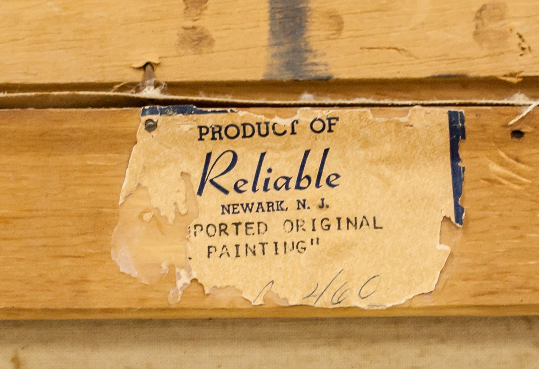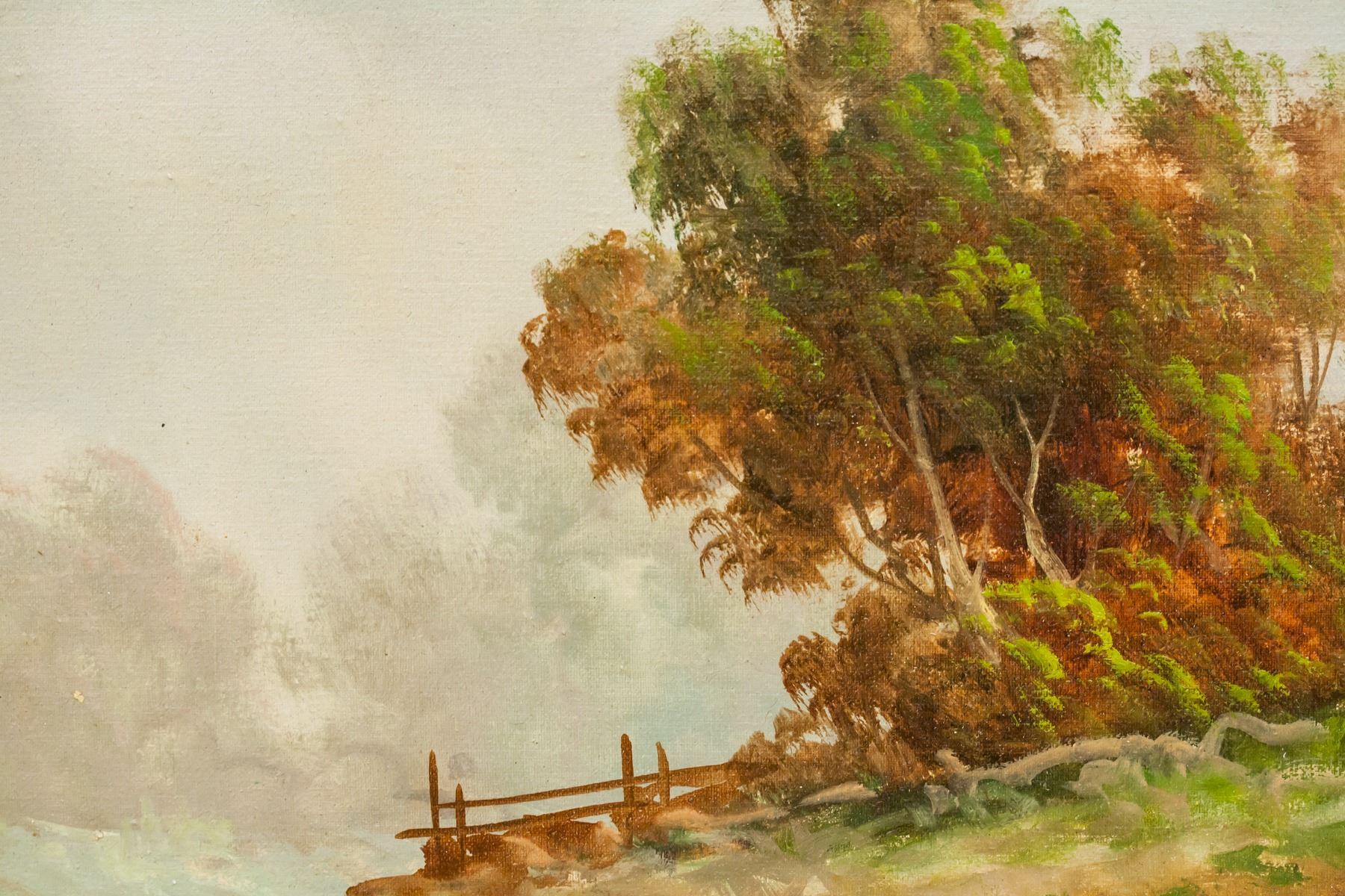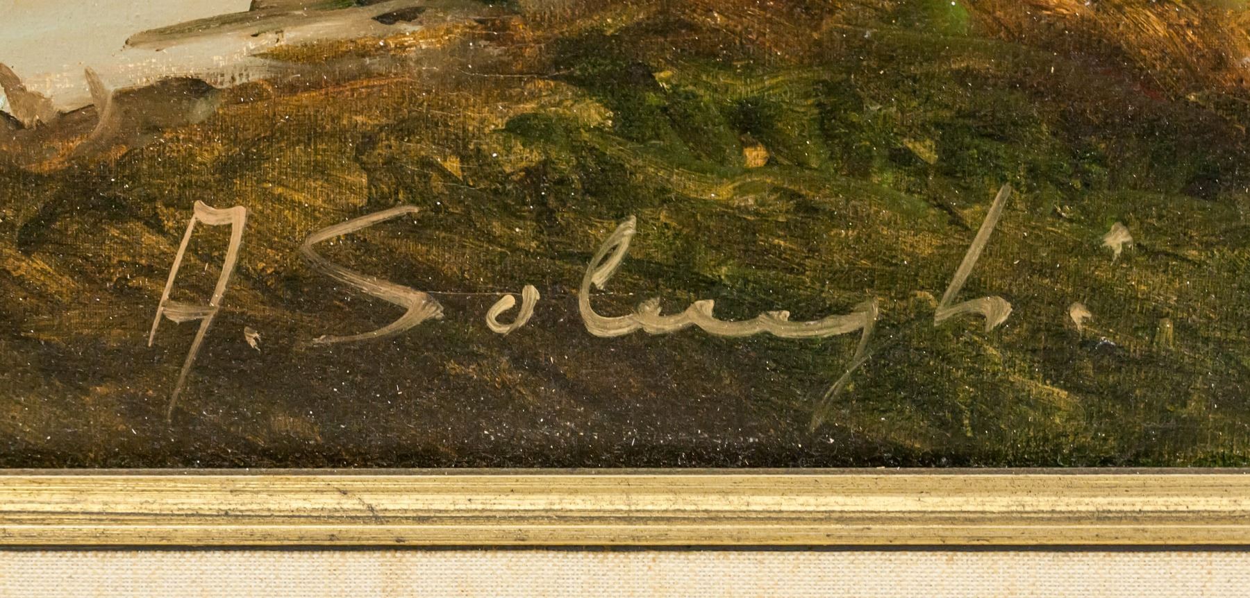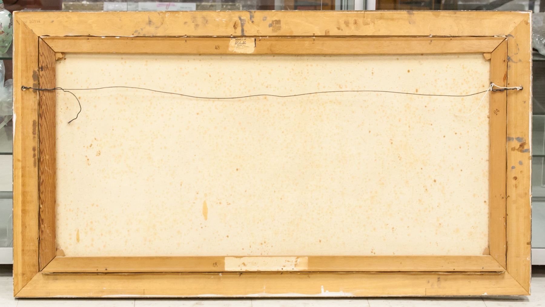 Oil on canvas, framed. Featuring a landscape scene of river and figure. Signed G. Solenghi on the lower left corner. Plaque inscribed SOLENGHI on lower portion of frame. Label affixed to stretcher bar inscribed PRODUCT OF Reliable NEWARK, N. J. IMPORTED ORIGINAL PAINTING and inscribed in pen 46C. Attributed to Giuseppe Solenghi (1879-1944, Italian). 60 x 120 cm (24 x 48 inches). Framed size: 76 x 136 cm (30 x 53.5 inches). PROVENANCE: This lot carries limited provenance from a Western United States collection (San Francisco).