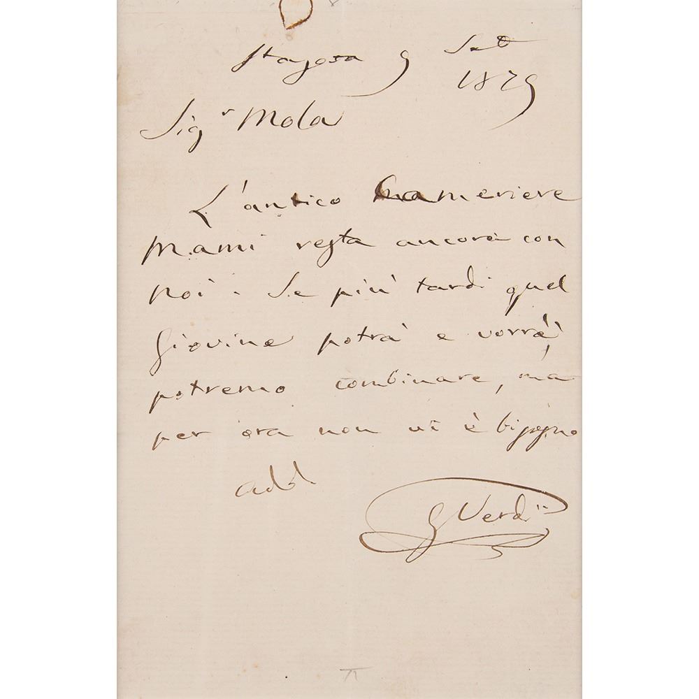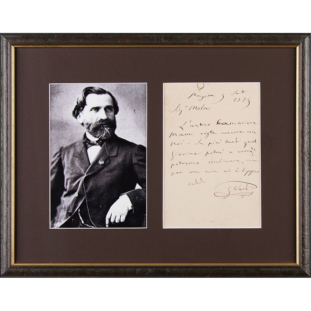 Italian composer (1813-1901) who was one of the most influential figures in the history of opera. ALS in Italian, signed “G. Verdi,” one page, 5 x 7.5, September 9, 1879. Untranslated handwritten letter by the celebrated composer. Archivally matted and framed with a portrait to an overall size of 16.25 x 12.75. In fine condition, with small rusty circular paperclip impression to the top edge.