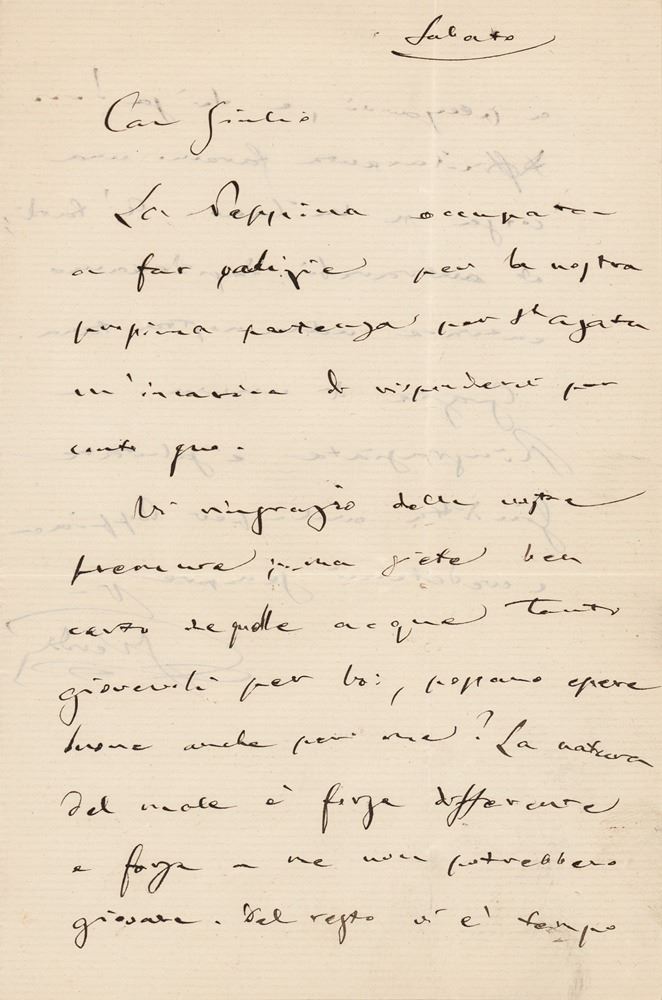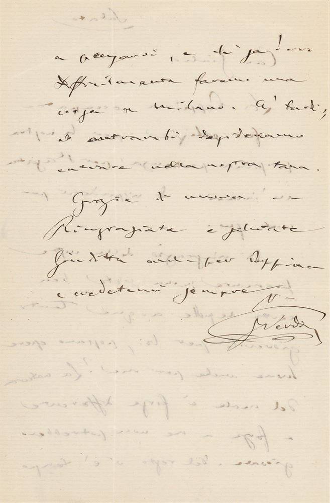 ALS in Italian, signed "G. Verdi," one page both sides, 5.25 x 8, no date. Untranslated handwritten letter from Giuseppe Verdi to music publisher Giulio Ricordi. In fine condition.