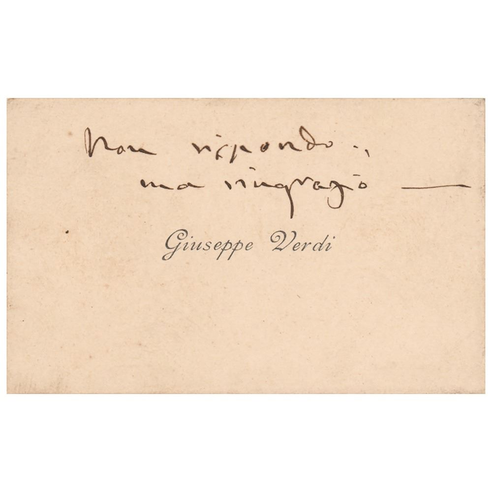 Giuseppe Verdi's personal calling card bearing his name printed in the center, 3.5 x 2, with words of thanks penned in Italian in black ink by Verdi. In fine condition, with old mounting residue on the back.