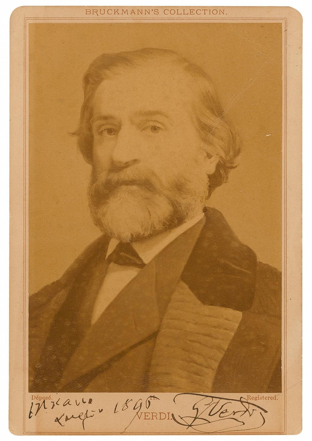 Italian composer (1813–1901) who was one of the most influential figures in the history of opera. Scarce original sepia 4.5 x 6.5 cabinet bust portrait of Verdi in an overcoat and suit, labeled at the top, “Bruckmann’s Collection,” and signed in the lower border in black ink, “G. Verdi 1896,” with another notation in Verdi’s hand in the lower left. In very good to fine condition, with crease to right side, light overall spotting to image, mild toning from previous display, lightly trimmed lower edge, and mounting remnants to reverse. The following year after signing this portrait, Verdi completed his last composition, a setting of the traditional Latin text Stabat Mater.