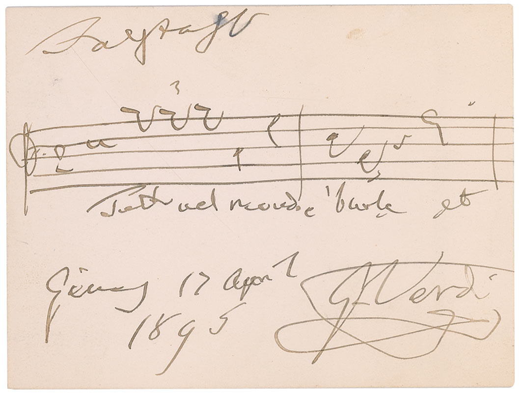 Italian composer (1813–1901) who was one of the most influential figures in the history of opera. AMQS on an off-white 3.75 x 3 card. Verdi pens two bars of music and lyrics from Falstaff, writing the opera’s name at the top, and adding the lyrics, “Tutto nel monde e burla et.” Signed at the bottom, “G. Verdi, Gènes, 17 April 1895.” In fine condition, with a uniform shade of light toning, a bit of scattered light soiling, and mounting remnants to reverse. A scarce and highly-desirable quotation from the maestro’s last opera.