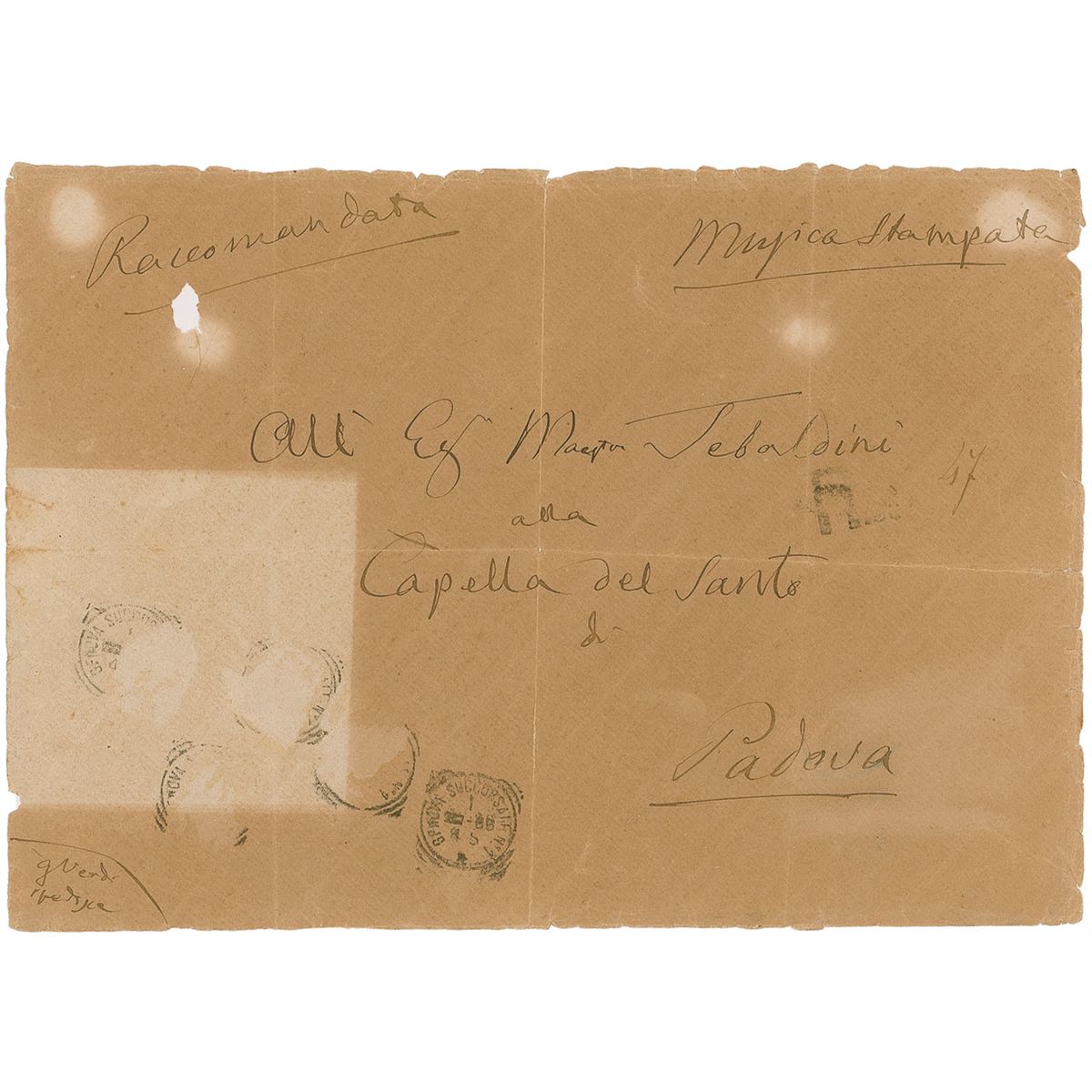 Unique envelope panel, 11.5 x 8, hand-addressed by Verdi to “Alli Eg Maesto Tebaldini alla Capella del Santo, Padova,” with “Musica Stampata” written in the top right corner, “Raccomandata” written in the return address portion, and “G. Verdi, Venice” penned in the bottom left corner. Intersecting folds, a uniform shade of toning with a large, lighter block of toning along the right edge and scattered spots towards the top half of the panel, tears along the edges, and a grouping of faded postage stamps, otherwise very good condition. A unique signature of the composer!