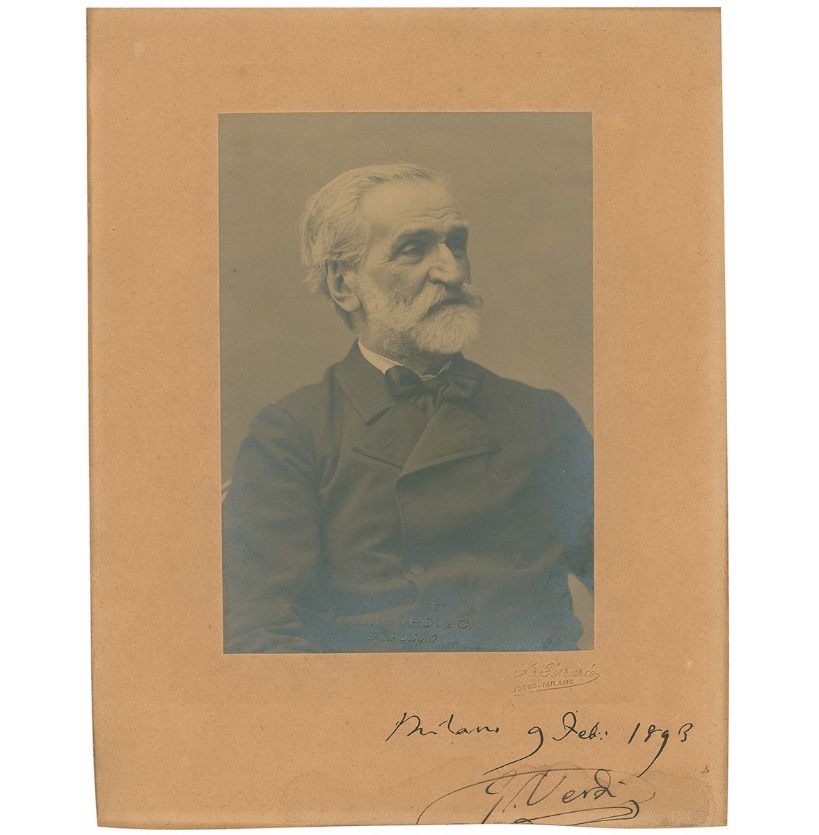 Italian composer (1813–1901) who was one of the most influential figures in the history of opera. Vintage matte-finish 4 x 5.75 half-length portrait of Verdi in a jacket and tie, stamped in the lower portion, “Ricordi & C. Deposto,” and affixed to its original A. Ferrario photographer’s mount, signed on the mount in black ink, “Milano, 9 Feb: 1893, G. Verdi.” In very good condition, with silvering to edges of image, photographer’s stamp to bottom of image, trimmed bottom edge of mount, and light dampstaining over signature.