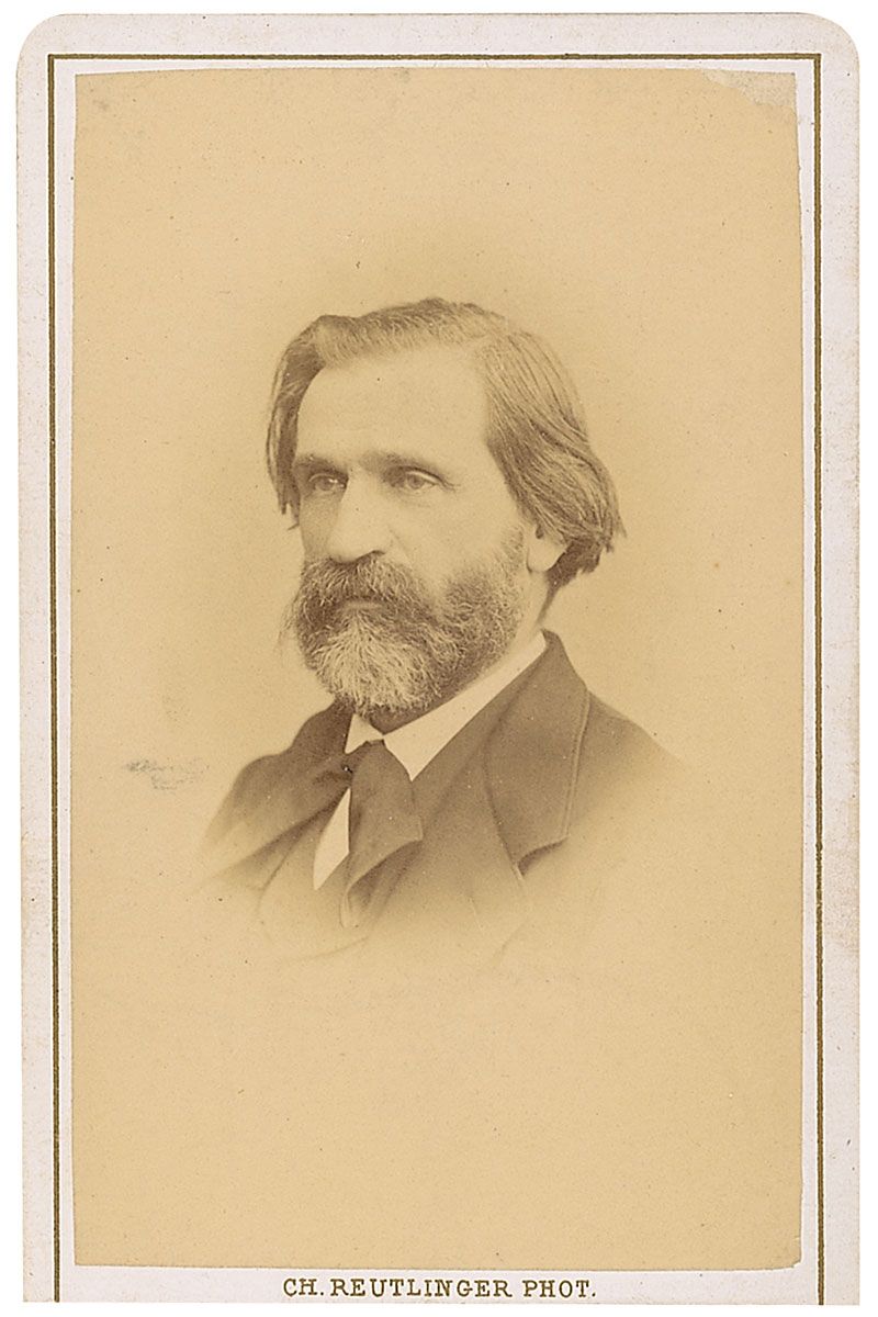Italian composer (1813–1901) who was one of the most influential figures in the history of opera. Unsigned original 2.5 x 3.75 carte-de-visite bust portrait by Ch. Reutlinger of Paris. Trimmed lower edge, otherwise fine condition.
