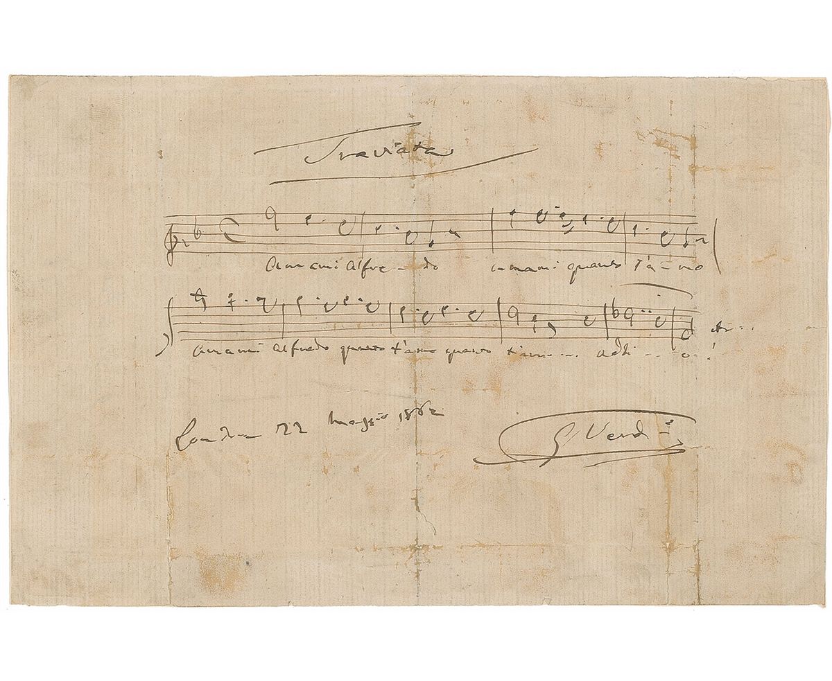 Italian composer (1813–1901) who was one of the most influential figures in the history of opera. AMQS on an off-white 8.25 x 5.25 sheet. Verdi pens 10 bars of music and lyrics from the dramatic high point of ‘La Traviata,’ signing at the conclusion, “G. Verdi, London 22 Maggio 1882.” Sheet is affixed to an identical size sheet. In very good to fine condition, with intersecting folds, a couple through the paraph of Verdi’s signature, a few small repairs, and scattered light toning and soiling.