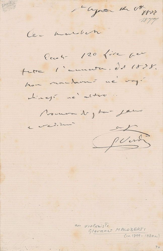 Italian composer (1813–1901) who was one of the most influential figures in the history of opera. ALS in Italian, signed “G. Verdi,” one page, 5 x 8, August 6, 1877. Letter to violinist Giovanni Maloberti, in full (translated): "Here you have 120 Lire for the whole year 1878. Do not send me either the Chinese vases or the other one." In fine condition, with light overall foxing. Maloberti was an Italian violinist and philharmonic concert in Piacenza who was a close friend of Verdi for more than fifty years. When Maloberti retired from playing music he became an antique dealer and, in Verdi, he found the ideal customer. The composer was, as the present letter suggests, a passionate antique collector and filled his homes with antique furniture, paintings and objet d'art.