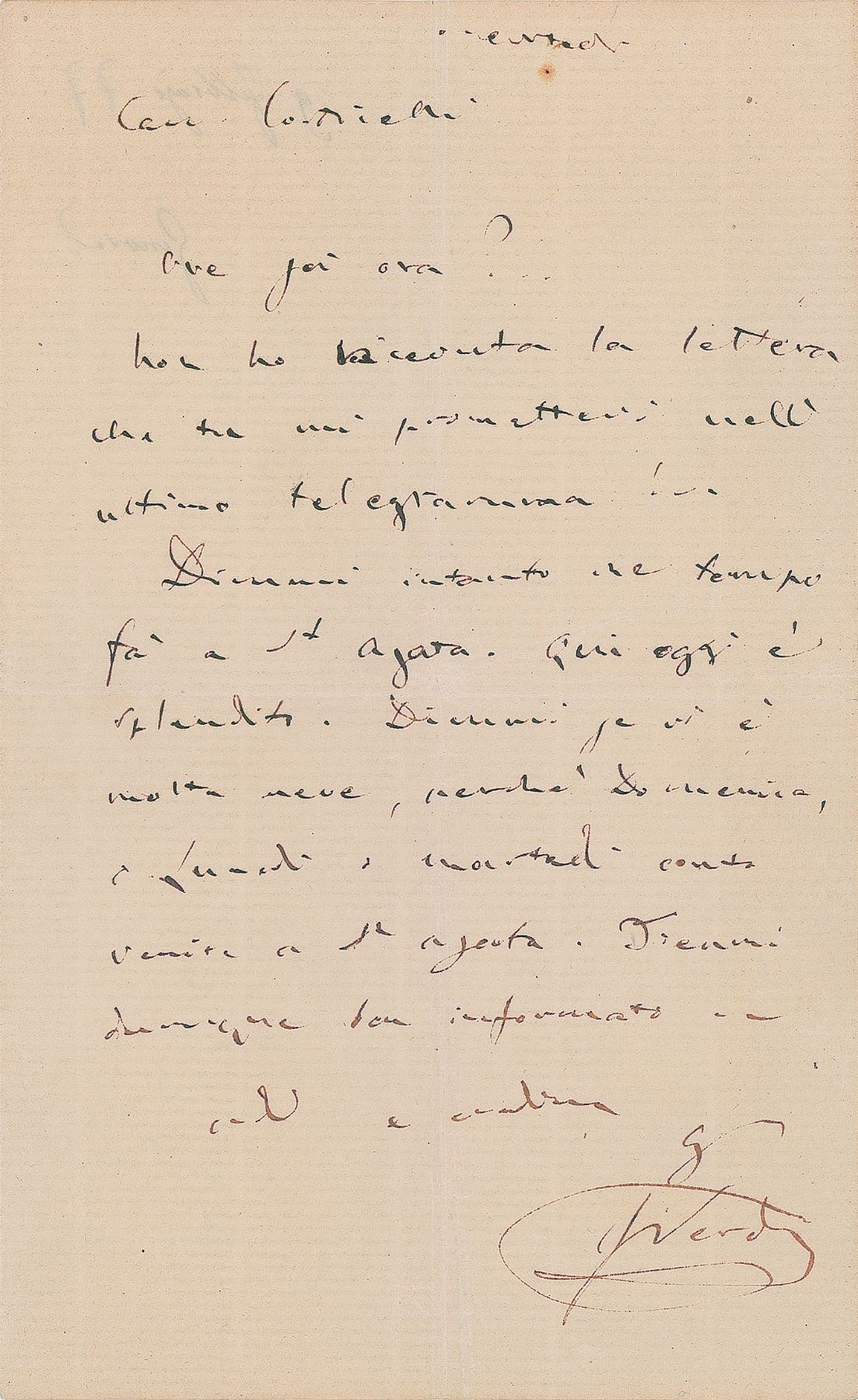 ALS in Italian, signed “G. Verdi,” one page, 5.25 x 8.25, [annotated February 9, 1877 on the reverse]. Letter to his close colleague Mauro Corticelli, written from Genoa, in full (translated): "Where are you now? I did not receive the letter you promised me in the last telegram! Tell me what time it is in St. Agata. Here today is splendid. Tell me if there is a lot of snow, because on Sunday, Monday, Tuesday, come to St. Agatha. Keep me well informed." In fine condition, with scattered light creasing. Beginning in September 1874, Verdi resided at the Palazzo del Principe in Genoa during winter.