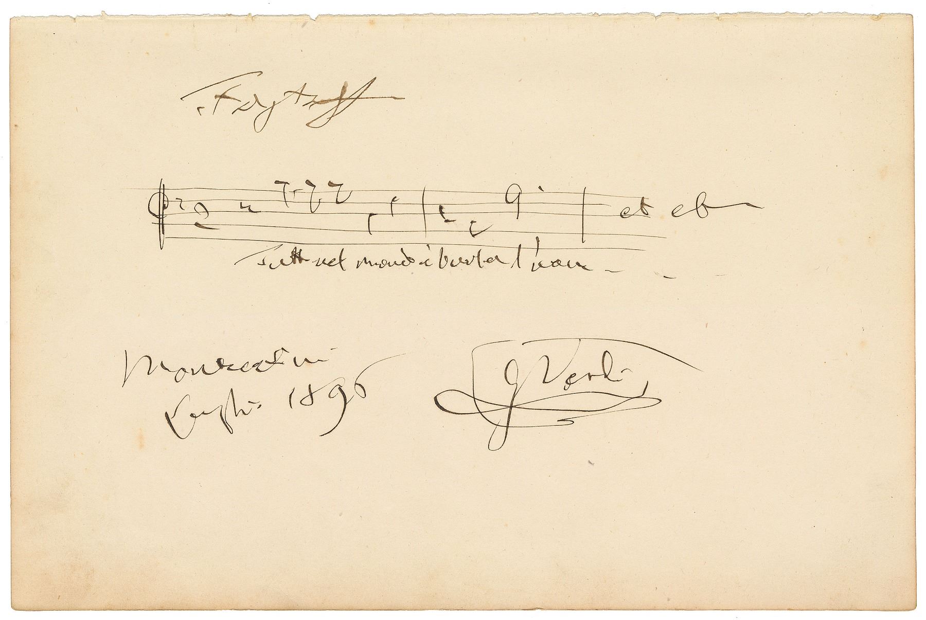 Extremely desirable AMQS on an off-white 8.5 x 5.75 album page, signed "G. Verdui," and dated 1896. Verdi pens two bars from his acclaimed opera "Falstaff," writing the lyrics in Italian below: "Tutto nel mondo e burla l'uom [All the world’s a jest]." In fine condition, with faint foxing and toning. Falstaff premiered at Milan’s La Scala on February 9, 1893, three years before Verdi penned the present quotation. The last of his 28 operas, Falstaff represents his second comedy and the third Verdi composition inspired by a Shakespearean play—the others being Macbeth and Otello. His choice of quotation derives from the conclusion of Act III, during which Sir John Falstaff asserts 'All the world's a jest, man is born a joker.’ A rare repertoire staple from the Italian master.