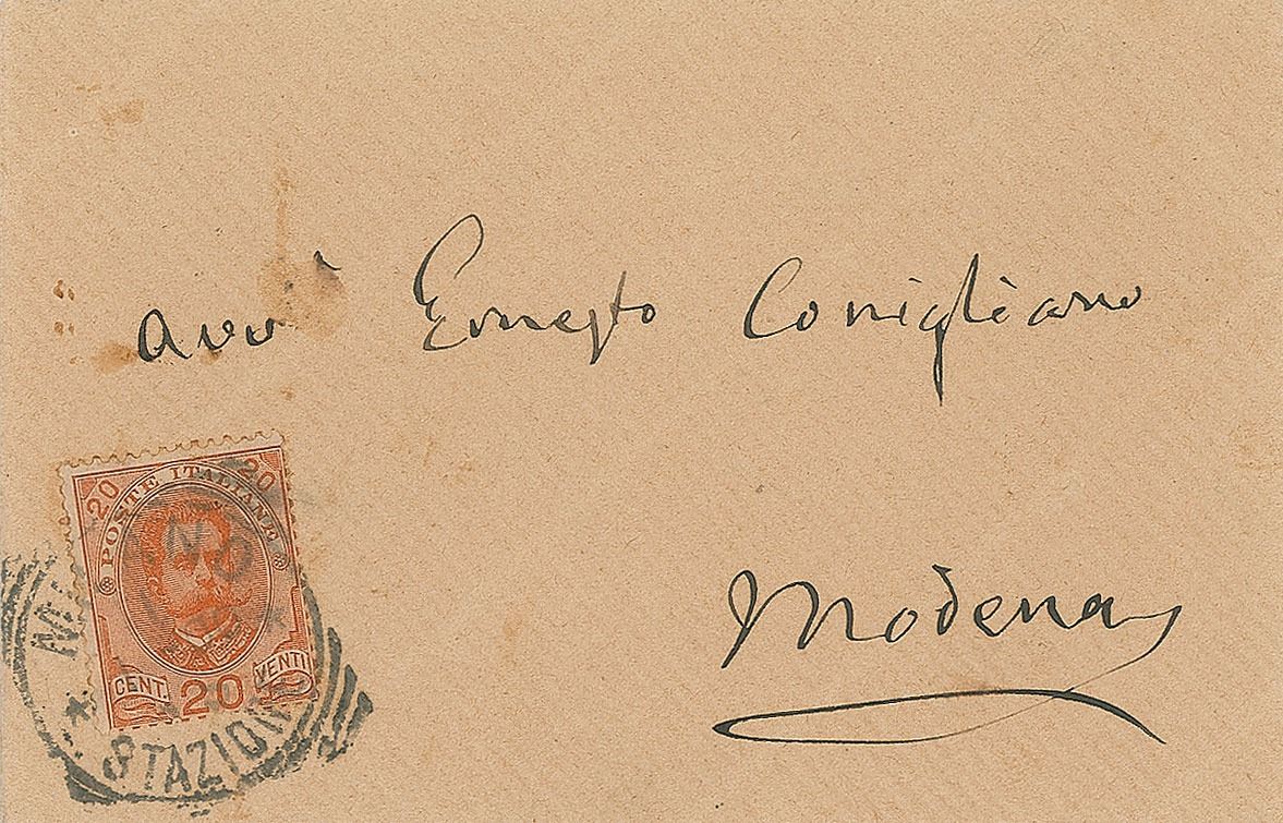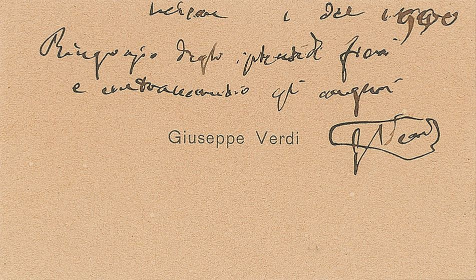 ANS in Italian, signed “G. Verdi,” penned on a 3.5 x 2 calling card belonging to Verdi, December 1, 1900. An untranslated note to Ernesto Conigliaro. In fine condition, with old adhesive residue to the upper corners of the blank reverse. Accompanied by the original mailing envelope, addressed in Verdi's own hand.