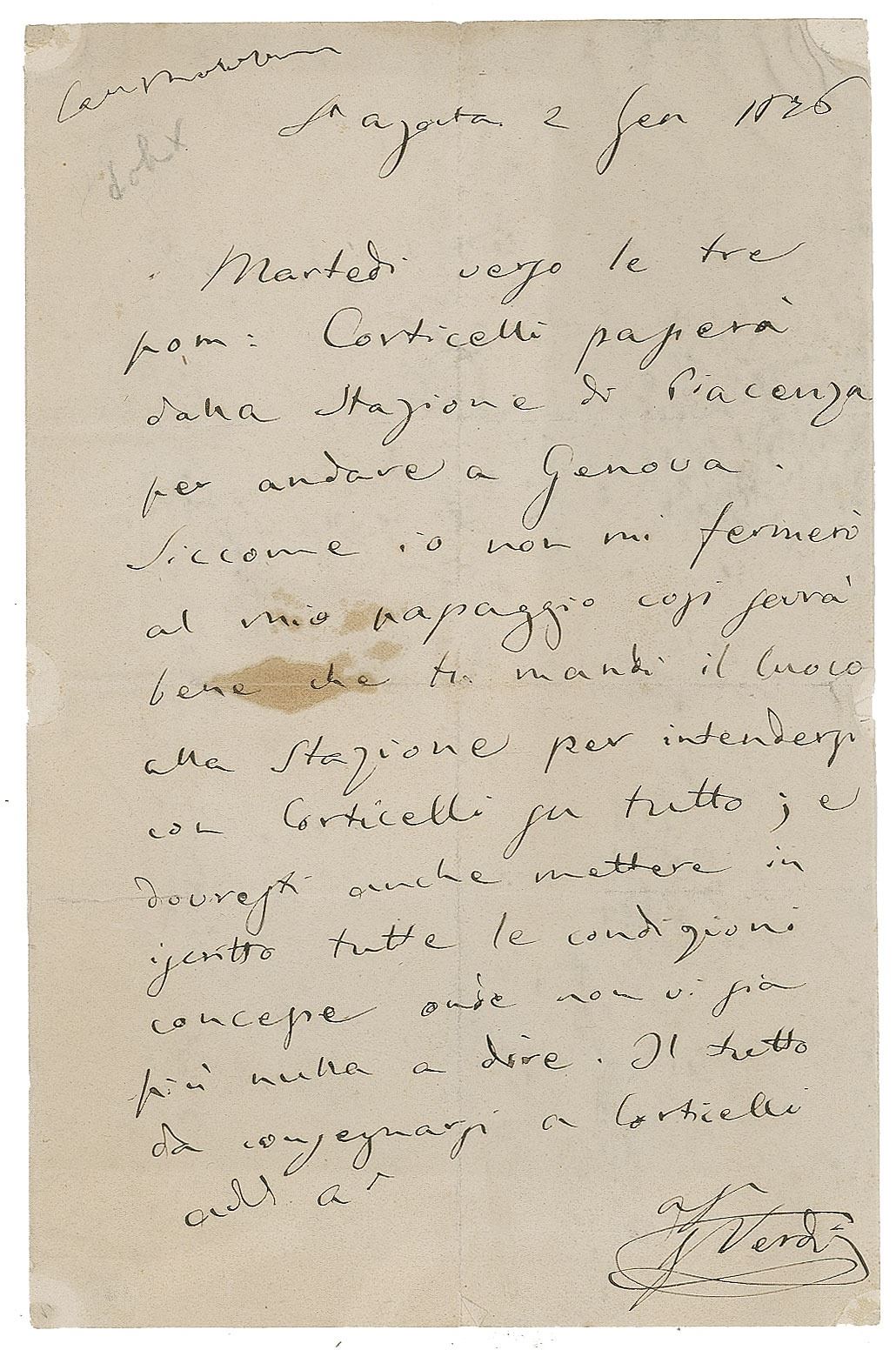 ALS in Italian, signed “G. Verdi,” one page, 5.25 x 8.25, January 2, 1876. Letter concerning the arrival of his Sant'Agata estate manager, Mauro Corticelli, at Piacenza while en route to Genoa. In part (translated): "Tuesday around three in the afternoon Corticelli will pass by Piacenza station to go to Genoa. Since I will not stop at my passage it will be good that you send the cook to the station to understand everything from Corticelli; and you should also put in writing all the conditions granted so that there is nothing more to say. All to be delivered to Corticelli." In very good condition, with light creasing, a stain to the text, semicircular stains to the corners and sides, and a small chip to the right edge.