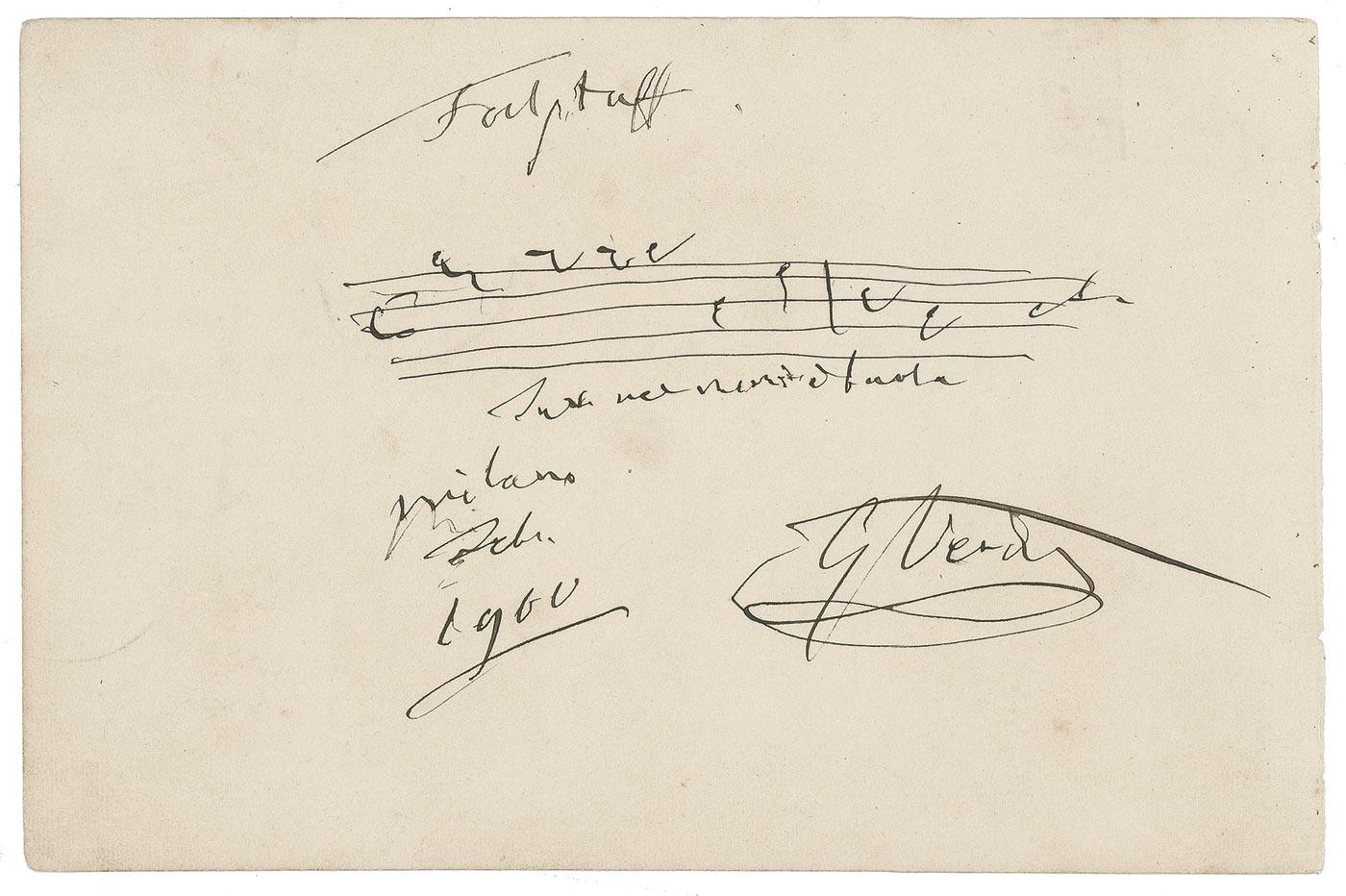 Outstanding and scarce AMQS, signed “G. Verdi,” two measures from his opera Falstaff (including sung text) on an off-white 8 x 5.25 album page, dated Milan, February 1900. Verdi’s text reads, “Tutto nel monde e burla.” The reverse bears a lengthy inscription in Italian in an unknown hand. In fine condition, with some very subtle scattered soiling and two small pieces of old tape on the reverse showing through lightly near top edge. The third Verdi opera to be based on a Shakespearean play, Falstaff has long been a favorite of both critics and musicians because of its brilliant orchestration, scintillating libretto, and refined melodic invention. The work, featuring the above final chorus (translating to ‘The whole world is a joke’) is in the standard repertoire of many opera companies. Historically, the plays of Shakespeare have been particularly difficult to translate into opera, with only about a half-dozen ever becoming part of the standard repertory. Remarkably, Verdi wrote three of those—Macbeth, Otello, and Falstaff—a phenomenal fact that validates his genius. A highly desirable piece of music history.