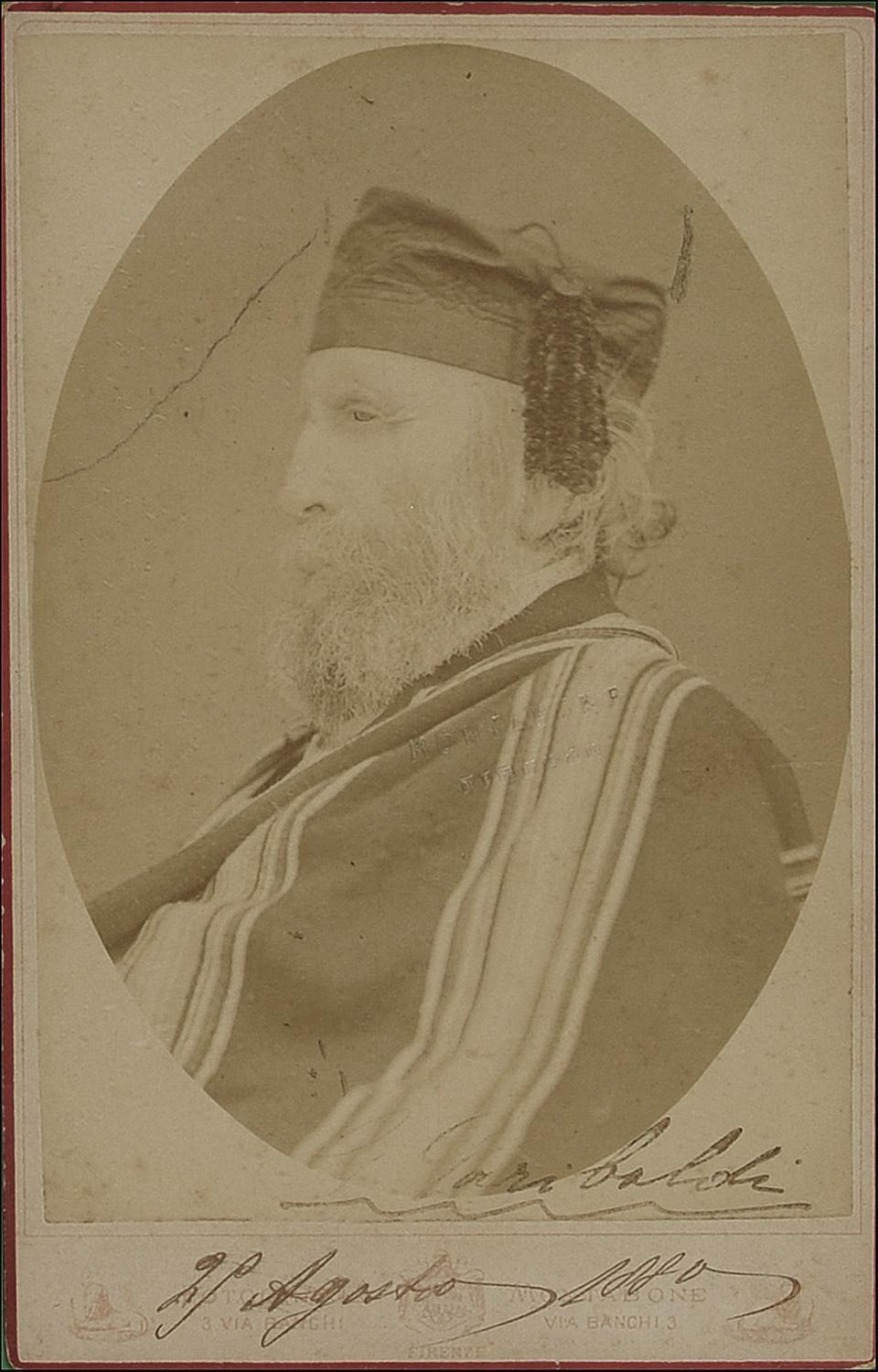 Original 4 x 6.5 cabinet photo by Montabone of Firenze, signed in black ink, “G. Garibaldi, 21 Agosto 1880.” Framed to an overall size of 10.5 x 14.5. First initial faded, and slightly legible, diagonal crease to top left, photographer’s stamp to image, and scattered light toning and soiling, otherwise very good condition.