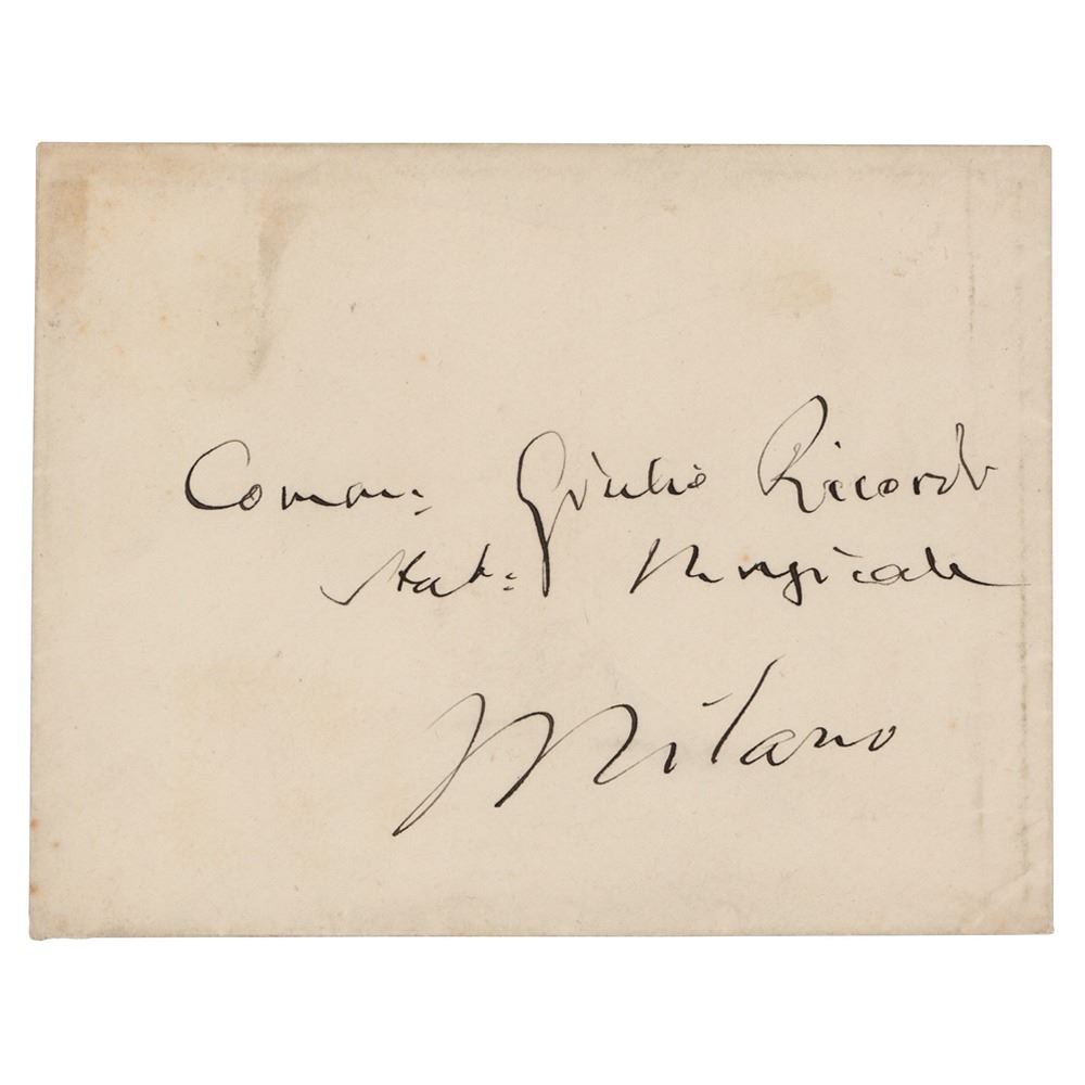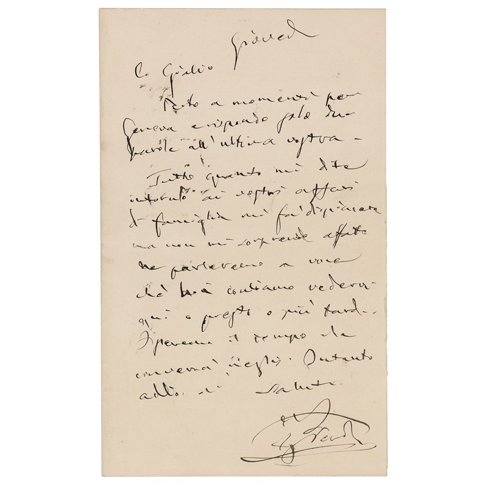 Italian composer (1813-1901) who was one of the most influential figures in the history of opera. ALS in Italian, signed “G. Verdi,” one page, 4.25 x 7, no date. Untranslated handwritten letter to music publisher Giulio Ricordi. In fine condition. Accompanied by the original mailing envelope, addressed in Verdi's own hand.