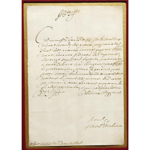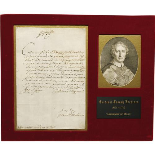 <B>Giussepe Cardinal Arcinto Autograph Letter Signed,</B></I> "<I>G Card Arcinto</B></I>", one page, 7.75" x 11.25", Milan, Italy, May 2, 1703, to unknown recipient. Giussepe Arcinto (1651-1712) was named Cardinal in 1699 and served as the Archbishop of Milan until his death. Matted with nameplate and engraved portrait. small split on left margin, else fine condition.