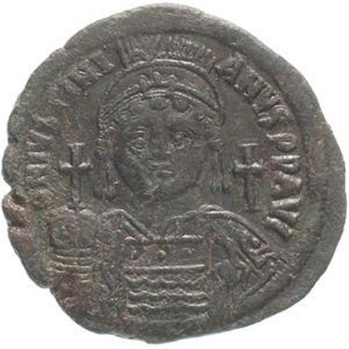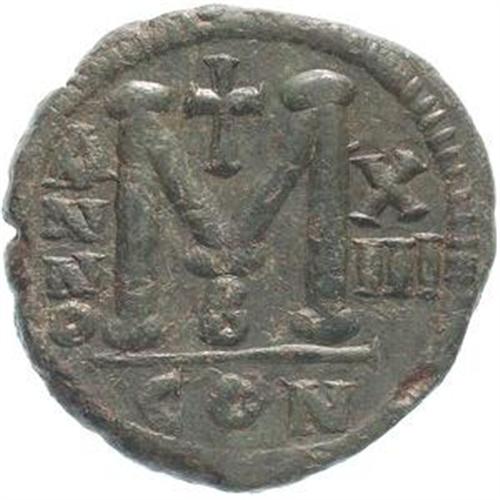 Monete Bizantine. Giustiniano I (527-565). Follis, Constantinople. D/ DN IVSTINIANVS PP AVG. Busto armato e corazzato di fronte, con globo crucigero e scudo. A destra, una croce. R/ ANNO XIIII. Grande M. Sopra, croce. Sotto, B. In esergo: CON. D.O. 37-61. gr. 22.77 AE. Bel BB+/qSPL. Magnifica patina verde.