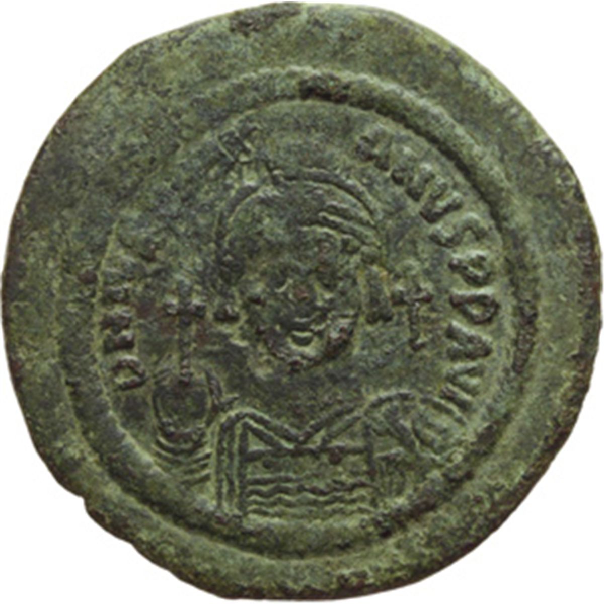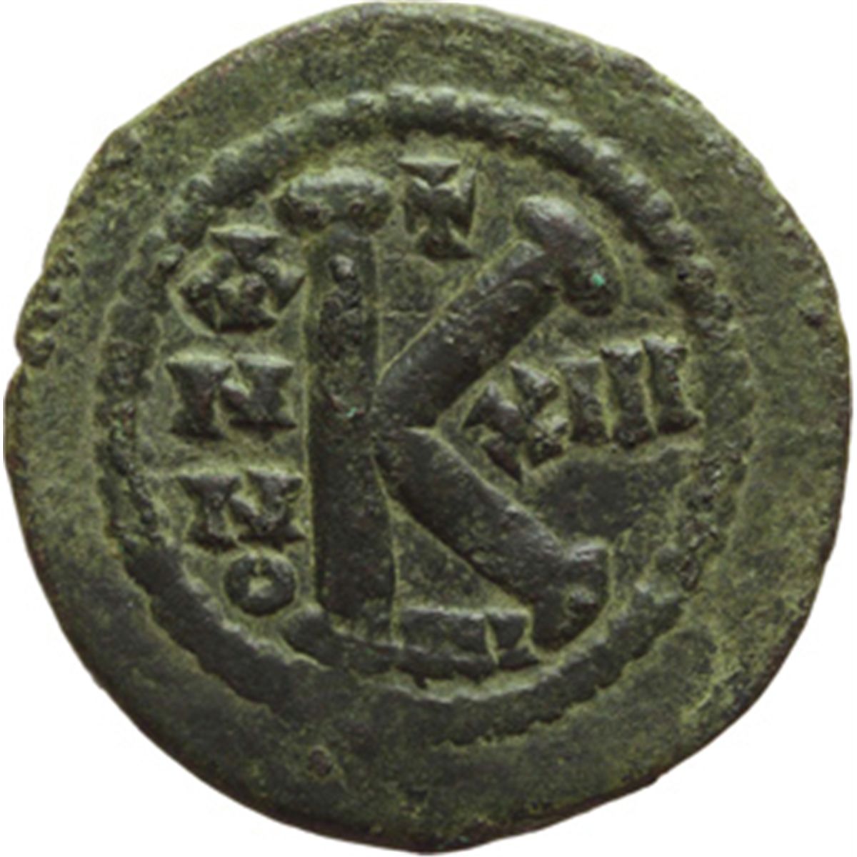 Impero Bizantino. Giustiniano I (527-565). Mezzo follis, Nicomedia. D/ D.N. IVSTINIANVS PP. AVG. Busto elmato, drappeggiato e corazzato di fronte, che tiene globo crucigero e scudo. A destra, croce. R/ ANNO XIII. Grande M. Sopra, croce. Sotto, NI. D.O.140. Sear 203. AE. g. 12.06 mm. 30.00 Di qualitv† eccellente per il tipo, coniato su flan straordinario. Patina verde. Bel BB+/qSPL.