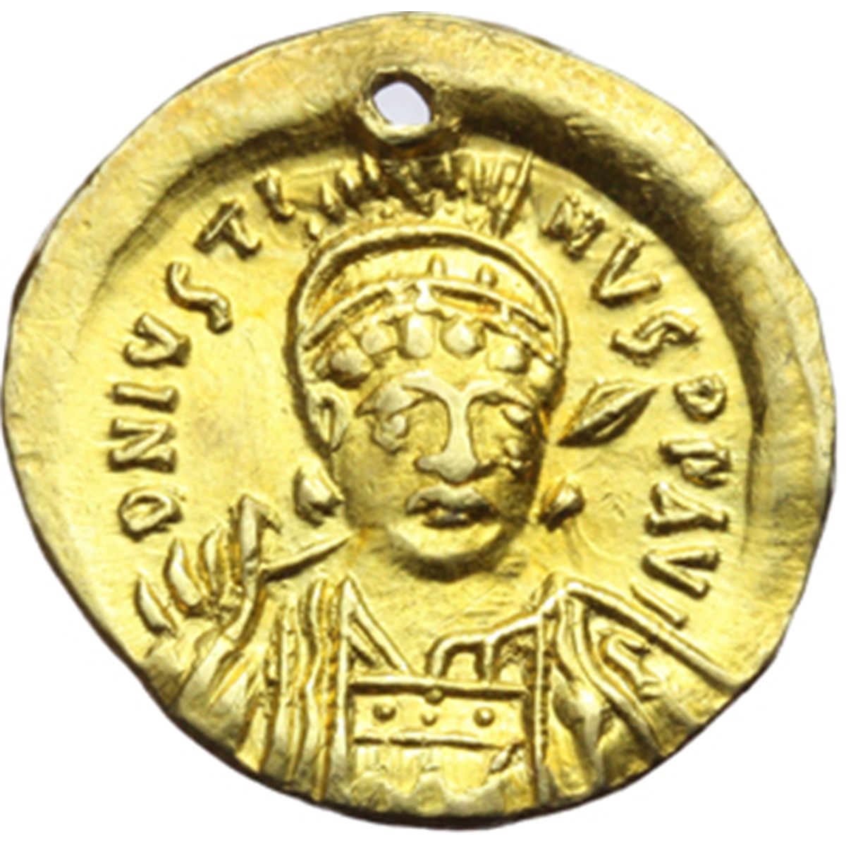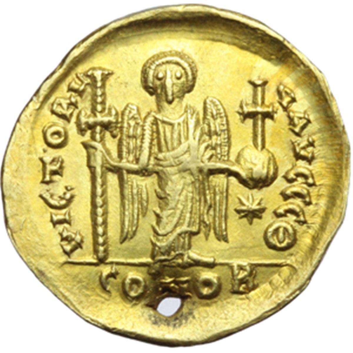 Impero Bizantino. Giustino I (518-527). Solido, Costantinopoli. D/ DN IVSTINVS PP AVI. Busto elmato e corazzato di fronte che tiene lancia e scudo. R/ VICTORIA AVGGGΘ. Angelo stante di fronte tiene lunga croce e globo crucigero. A destra, stella. In esergo: CONOB. D.O.2. Sear 56. AU. g. 4.18 mm. 20.00 Foro di appensione, altrimenti bel BB+.
