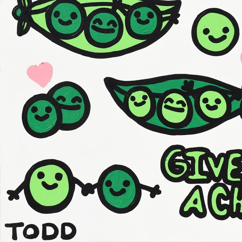 "Give Peas A Chance" is an original acrylic painting on gallery wrapped canvas by Todd Goldman, hand signed by the artist. Includes Letter of Authenticity. Measures approx. 48" x 60" (image). Due to the way this piece was stored there may be minor wear or signs of age (such as wear on the corners) but the piece is in overall good condition.
