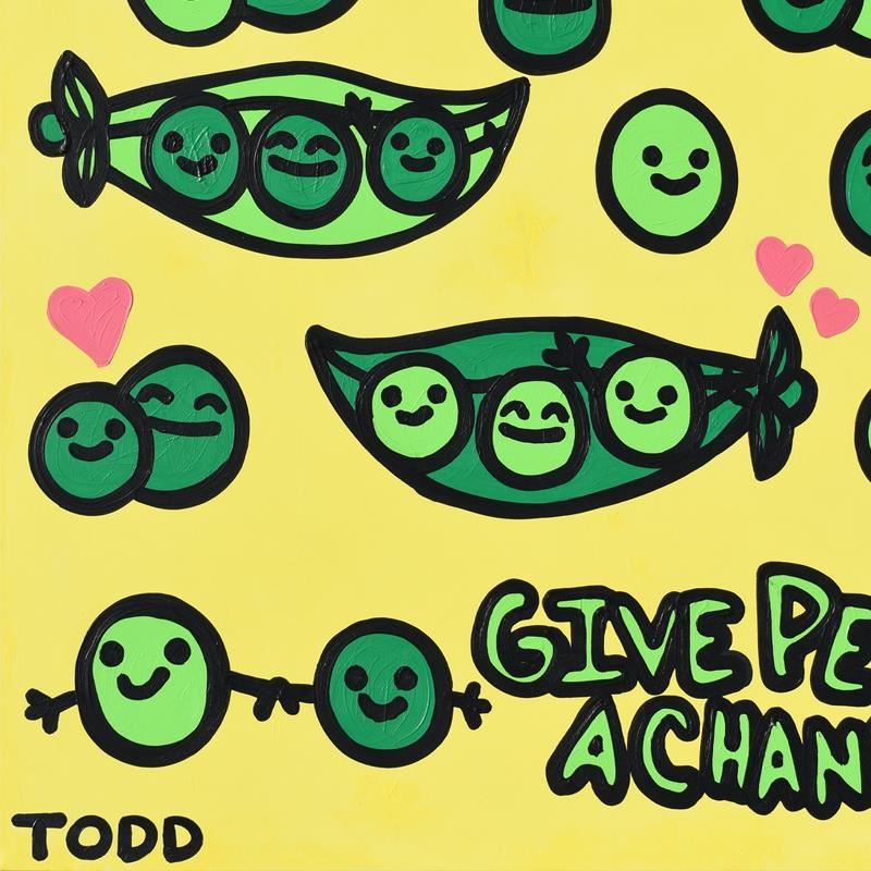 "Give Peas A Chance" is an original acrylic painting on gallery wrapped canvas by Todd Goldman, hand signed by the artist. Includes Letter of Authenticity. Measures approx. 48" x 60" (image). Due to the way this piece was stored there may be minor wear or signs of age (such as wear on the corners) but the piece is in overall good condition.