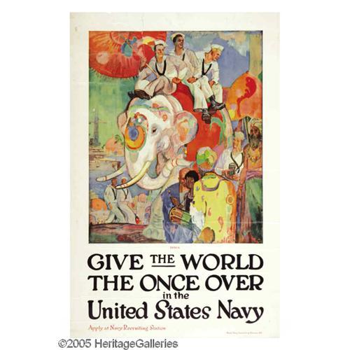 <B>Give the World the Once Over</B></I> (Lot of 2) 43" x 28". Artist: James H. Doherty. This poster depicts several sailors riding atop an elephant in India as they gaze at the surroundings. This type of recruitment poster promised world travel and experience, and is prized by collectors. Recruitment posters are always a popular item, but one with such a playful and hopeful image is rare and exceptional! <BR><BR>Condition:<BR> Poster 1-Good; severe tear on top edge as well as several minor ones, creasing along x-axis, some dirt staining. <BR>Poster 2-Fair; cockling from severe fold memory, major tears on top edge which extend into the graphic, foxing and dirt stains on verso, upper left edge has burn damage, adhesive stickers on back need removal before damage occurs.