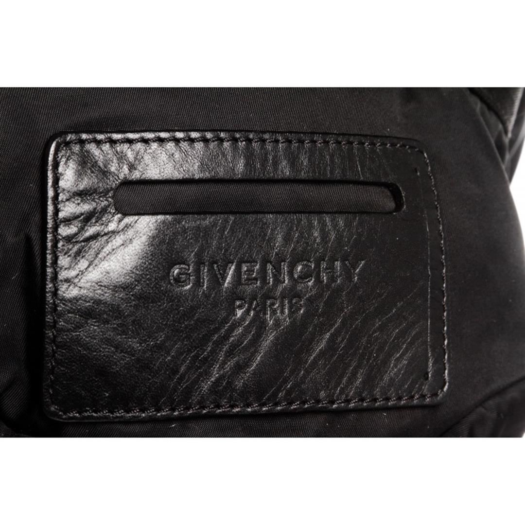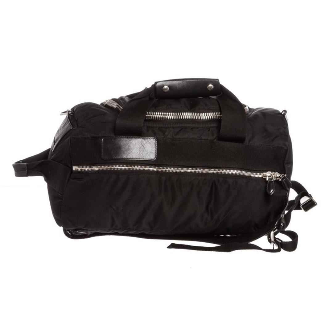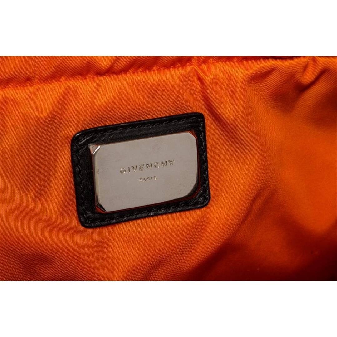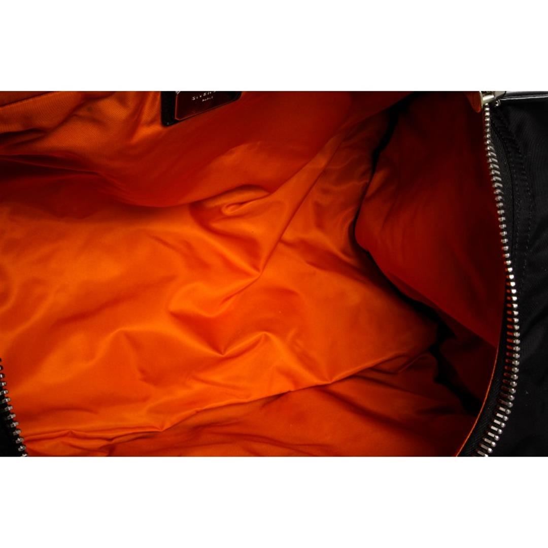 Crafted out of black nylon, leather trim, frontal zip pocket, dual side zip pockets, and silver-tone hardware. Inner orange nylon lining. Item is pre-owned.