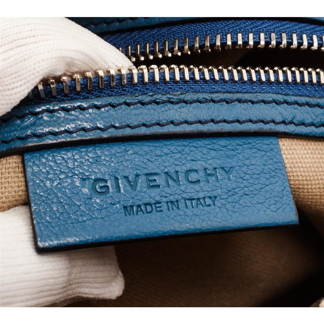 Givenchy blue grained leather Mini Antigona bag with silver-tone hardware, beige canvas lining, two interior slip pockets, interior zip pocket, optional leather shoulder strap, and zip top closure. Authentic.