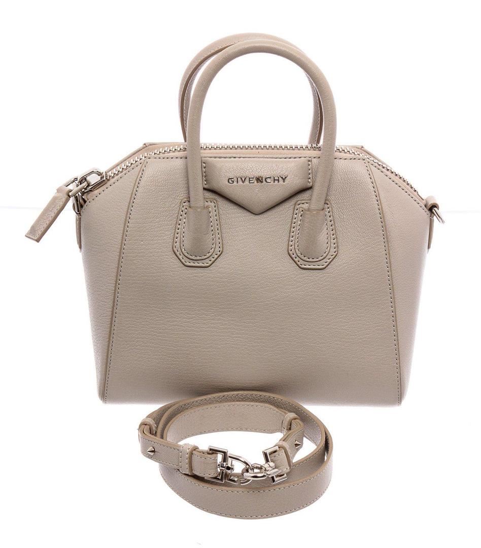 Cream leather Givenchy Mini Antigona satchel with silver-tone hardware, dual rolled top handles, detachable flat shoulder strap, logo adornment at front, protective feet at base, beige canvas lining, three pockets at interior; one with zip closure and zip