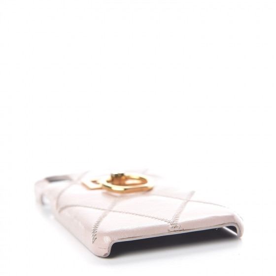 Pale Pink phone case is finely crafted of smooth diamond-quilted goatskin leather in pale pink. It features a front logo plaque, gold hardware, and a rotating metal ring.