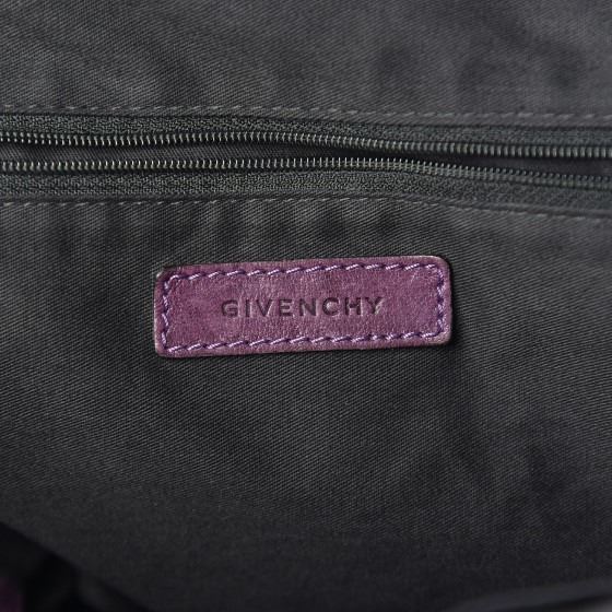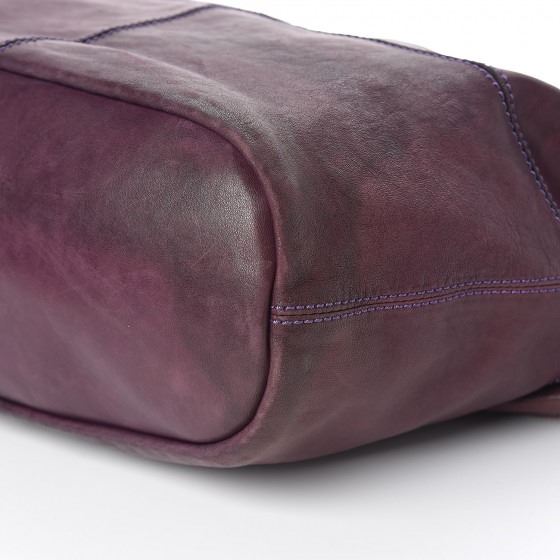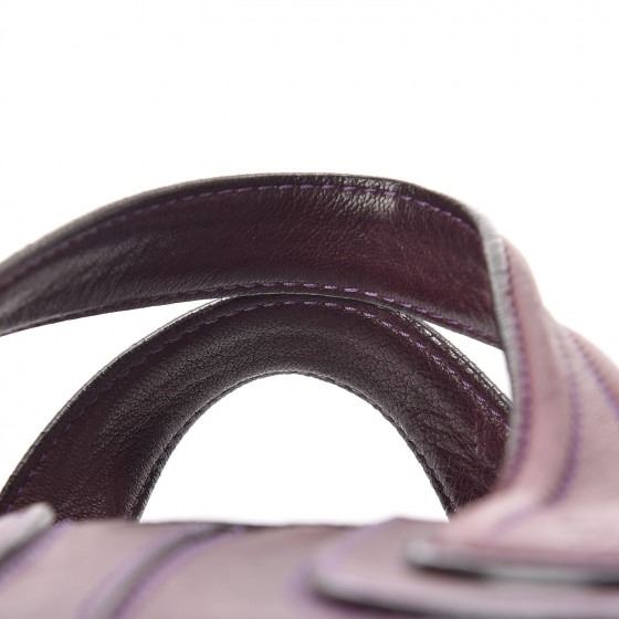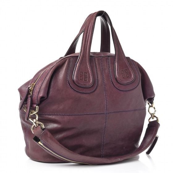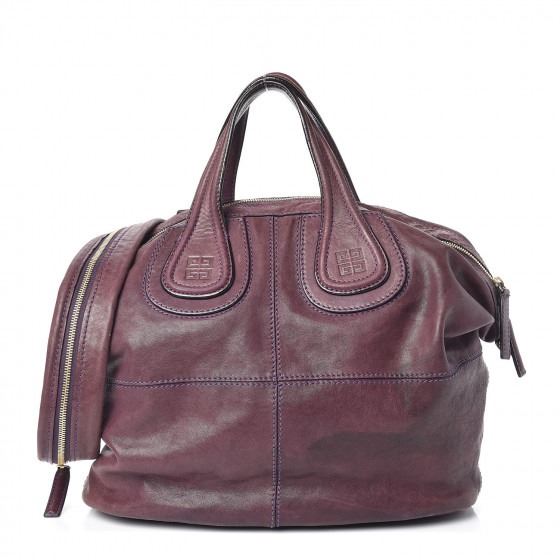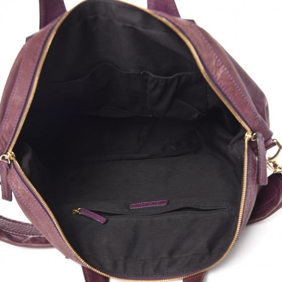 Nightingale Aubergine textured lambskin leather in deep purple. The bag features leather strap top handles, and an optional shoulder strap with light gold hardware. The top zipper opens to a black fabric interior with zipper and patch pockets.