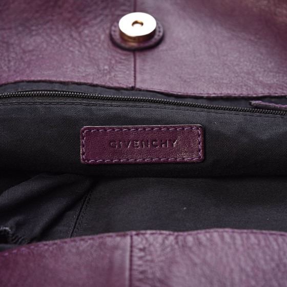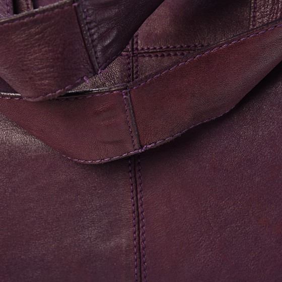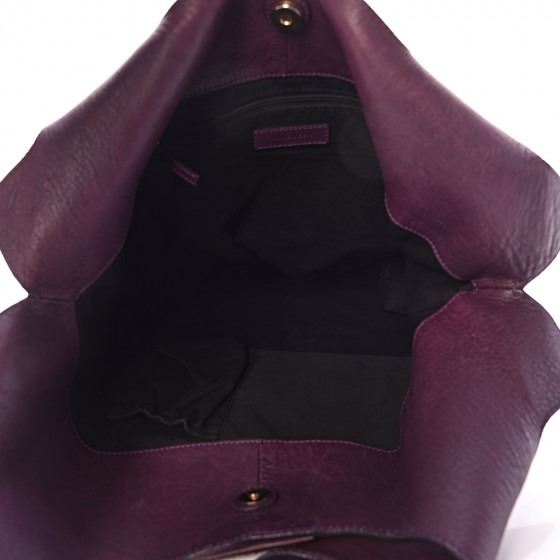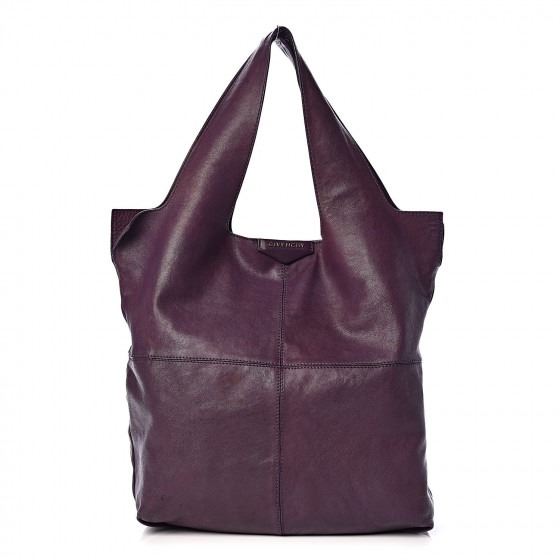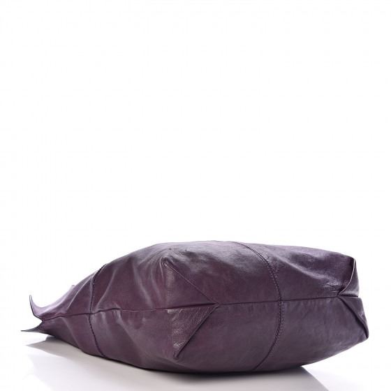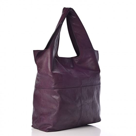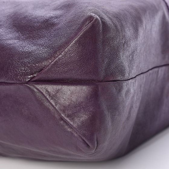 Details: Purple tote is crafted of fine dark purple lambskin leather with matching top handles. The top is open to a black fabric interior with zipper and patch pockets.