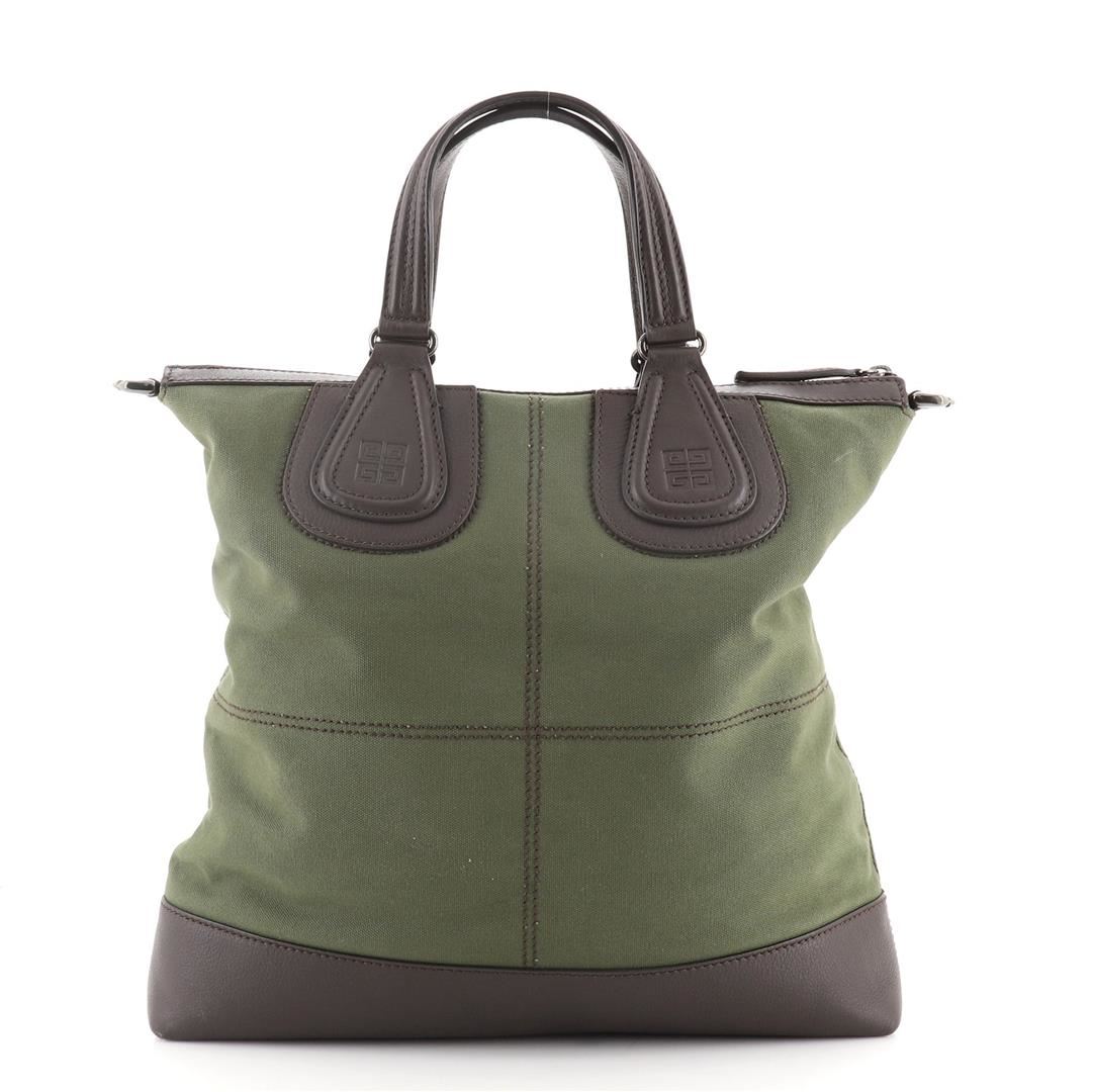 Givenchy Nightingale Flat Shopper Tote Canvas with Leather Brown, Green Condition Details: Minor scuffs and wear on leather trims and handles, light marks on exterior, wear on base corners, scratches on hardware. 5 Height 15", Width 14.5", Depth