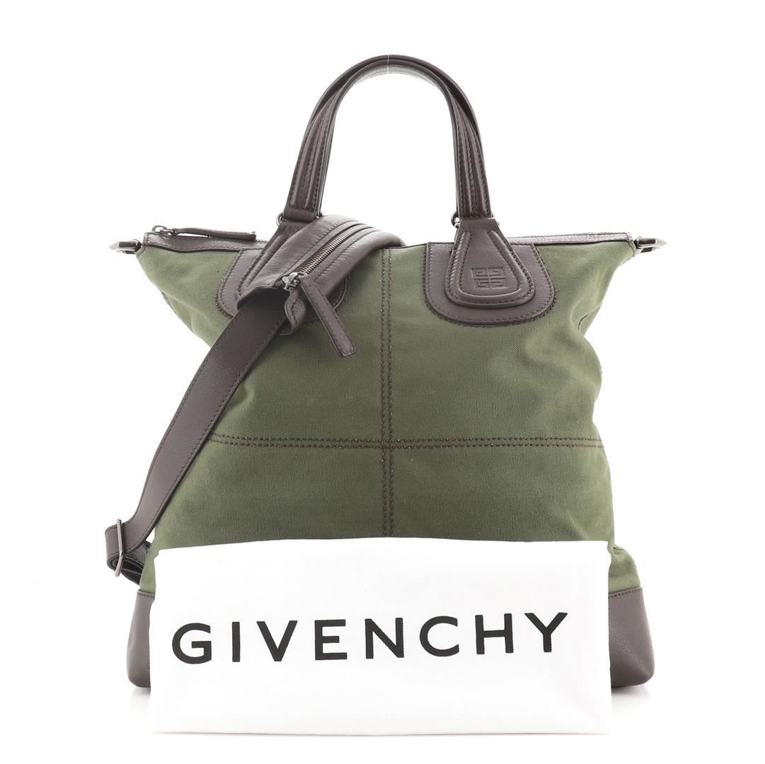One Givenchy Nightingale Flat Shopper Tote Canvas with Leather Brown, Green. Item is sold AS-IS. All available information is listed in the description and shown in the photo. Givenchy Nightingale Flat Shopper Tote Canvas with Leather Brown, Green Condition Details: Minor scuffs and wear on leather trims and handles, light marks on exterior, wear on base corners, scratches on hardware. Height 15", Width 14.5", Depth 3", Strap Drop 12-22