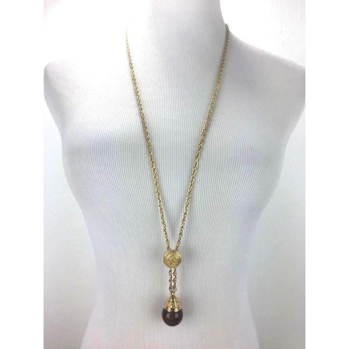 Givenchy Paris, designer extended length statement necklace. Gold-tone with brown lucite pendant.
